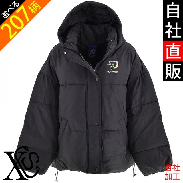 おもしろ ワンポイント 刺繍 フェイク ダウンジャケット レディース アウター 裾ラウンド フード付き 長袖 雑貨 グッズ 自社ブランド オモシロ 文字 面白い クリスマス ori-a-jkt20-b03-s