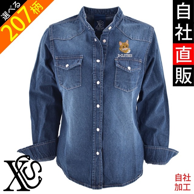 おもしろ ワンポイント 刺繍 長袖 ノーカラー ウエスタン デニムシャツ レディース トップス 薄手 大きいサイズ 雑貨 グッズ 自社ブランド オモシロ 文字 面白い クリスマス ori-aw-dts6-b03-s