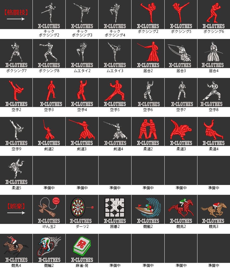 X-CLOTHES 競技音楽一覧:けん玉 アメフト キックボクシング ギター ゴルフ サッカー サックス サーフィン スキー スケートボード スノーボード ダンス ダーツ チューバ テニス トロンボーン ドッチボール ハンドボール バイオリン バスケ バドミントン バレエ バレーボール ピアノ フィギュアスケート フラガール ベース ボクシング ボーリング マラソン ムエタイ ヨガ ラグビー ラケット 体操 剣道 卓球 和太鼓 囲碁 大相撲 居合 弓道 柔道 歌舞伎 水泳 水球 白連獅子 白連獅子毛振り 空手 競艇 競輪 競馬 茶道 西馬音内盆踊り 赤連獅子 赤連獅子毛振り 越中おわら踊り 郡上踊り 野球 釣り 阿波踊り 陸上 陸上走り 音符 麻雀-発 1 2 3 4 5 6 7 8 9 0