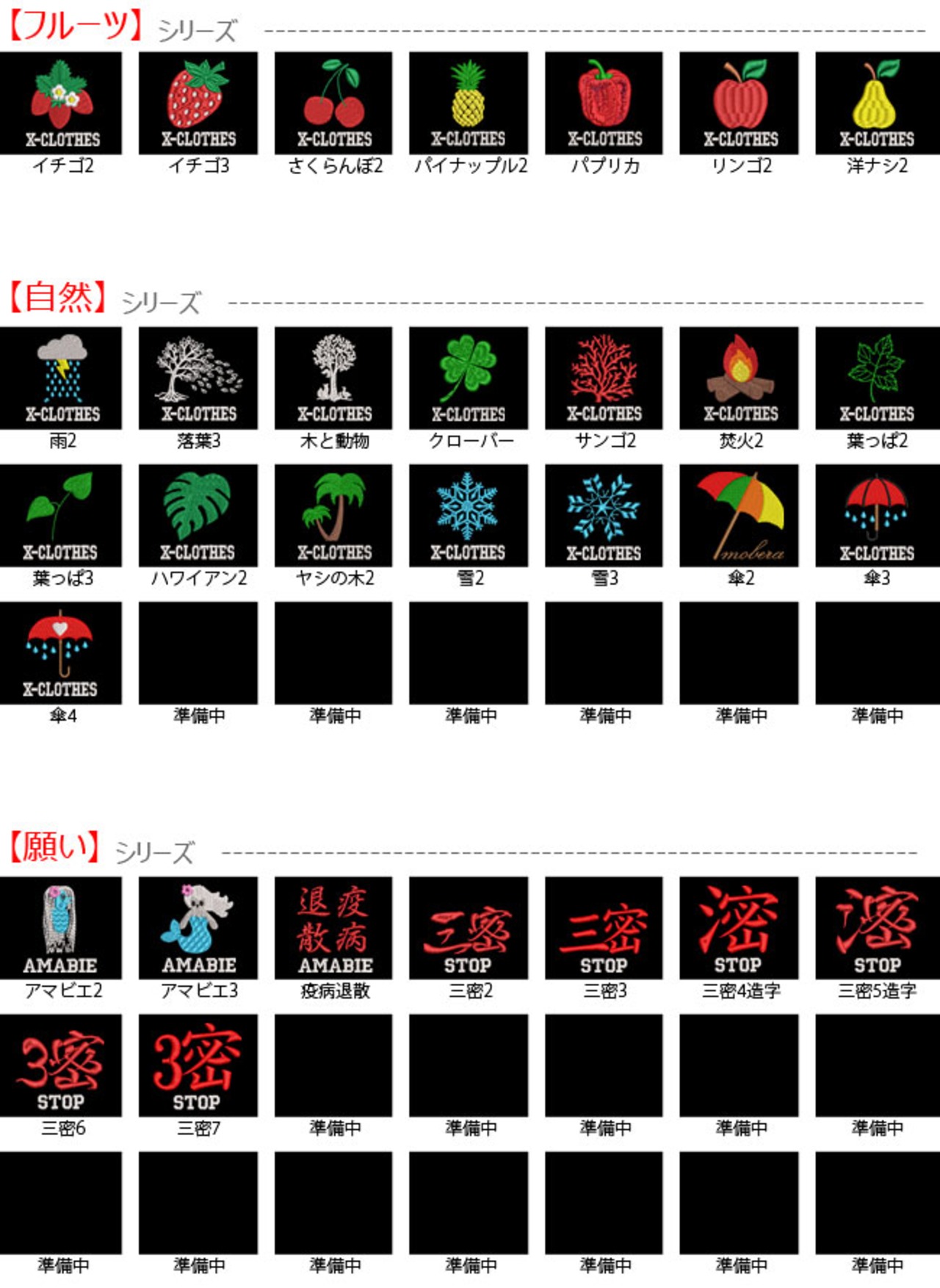 対応刺繍一覧:X-CLOTHES A B C D E F G 2 3 4 5 6 7 8 9 10 11 12 13 14 15 16 17 18 19 20 21 22 23 24 25 26 27 28 29 30 31 32 33 34 35 36 37 38 39 猫 パンダ 犬 アライグマ うさぎ ウサギ カメ キツネ コアラ ハリネズミ 針ネズミ リス 狼顔 狼 熊顔 熊 虎 豹顔 豹 ライオン ライオン顔 牛 赤馬 馬 キリン 麒麟 鹿 シマウマ 象 羊 ムース ラクダ カマキリ 蜘蛛 蜘蛛の巣 サソリ トンボ 蝶 蜂 イグアナ カメレオン トカゲ ワニ イルカ カジキ 鯉 鯨 グッピー クマノミ 魚 サメ タコ タツノオトシゴ 熱帯魚 マグロ インコ クジャク 小鳥 鶏の親子 シマエナガ 鷹 ハチドリ ハト ひよこ フクロウ フラミンゴ 文鳥 ペンギン 梅 桜 ハイビスカス 花 薔薇 かぼちゃ キノコ さやえんどう X唐辛子 ハート唐辛子 トマト ナス 人参 白菜 ブロッコリー ラディッシュ イチゴ さくらんぼ パイナップル パプリカ リンゴ 洋ナシ 雨 落葉 傘 木と動物 クローバー サンゴ 焚火 葉っぱ 葉っぱ ハワイアン ヤシの木 雪 グッズ 珍しい 雑貨 プレゼント 誕生日 ギフト 卒団 記念品 部活 卒業 アマビエ 三密 あまびえ 3密 疫病退散 夏用