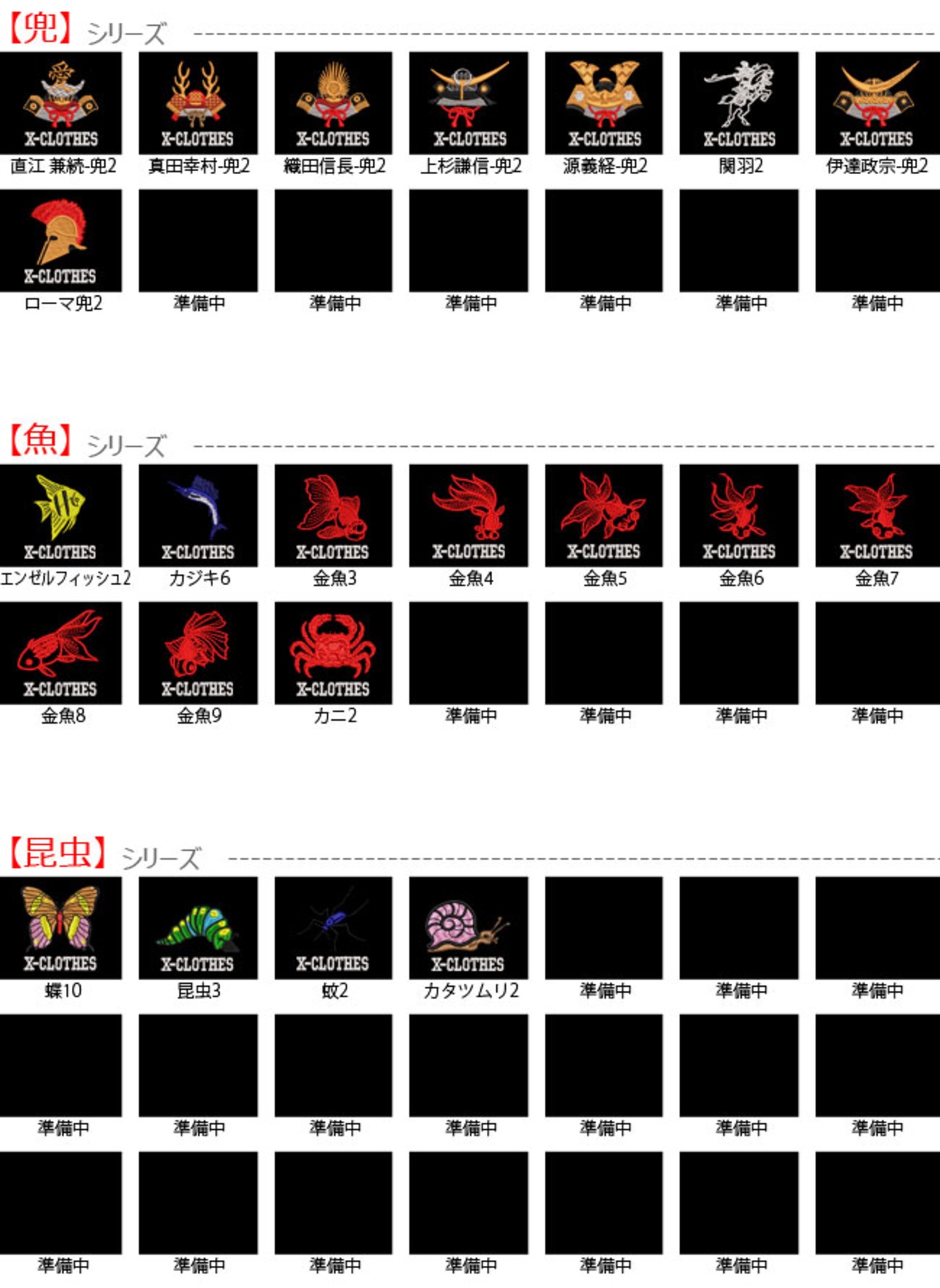 対応刺繍一覧:X-CLOTHES 兜 直江兼続 ローマ 伊達政宗 源義経 上杉謙信 織田信長 真田幸村 関羽 金魚 カニ 柴犬 ゴードンセッター サモエド ダックスフント トイプードル ドーベルマン ハスキー バセット パピヨン ペキニーズ ロットワイラー 柴犬 狆 チワワ キャバリア グレートデーン コーギー シーズー 秋田犬 ダルメシアン トイテリア スパニエル ラッセルテリア シェパード パグ ハスキー ビーグル フレンチブルドッグ ボーダーコリー ボストンテリア ポメラニアン マルチーズ ミニチュアダックス ヨークシャーテリア 豆柴 グレーハウンド ゴールデンレトリバー シュナウザー チューバ トロンボーン 囲碁 競艇 競馬 競輪 将棋 日本酒 アメフト テニス カーネーション おにぎり オムレツ キュウリ トマト ビール ブロッコリー もつ鍋 ラーメン 寿司 焼き鳥 焼肉 桃 目玉焼き 餃子 鳳凰 インコ カワセミ コザクラ セキセイ フクロウ ペンギン 鷹 ボタン マメルリハ 桜 文鳥 オカメ コザクラ シルバー ハシビロコウ カンガルー コアラ ボスゴリラ 恐竜 ハムスター パンダ ユニコン 牛 虎 子豚 カメ 狼 ライオン うさぎ モモンガ レッサー 龍 アルパカ カワウソ チンチラ 猫 黒 白 馬