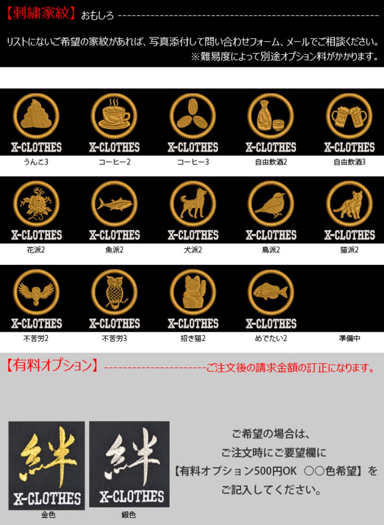 対応刺繍一覧:X-CLOTHES 伊達政宗 檜扇 違い矢 井桁 右重ね違い鷹の羽 下がり藤 花菱 割り菱 鬼蔦 亀甲に花菱 安藤藤 桔梗 橘 九つ星 九枚笹 九曜 隅立て四つ目 剣花菱 剣三つ柏 剣片喰 五瓜に唐花 庵木瓜 五三桐 五本骨扇 根笹 左三階松 笹竜胆 三つ引き 三つ星 三つ星に一の字 三つ柏 陰蔦 三つ鱗 三階菱 四つ目菱 四方剣花菱 四方木瓜 七つ星 十字 松皮菱 上の字 尻合わせ三つ蔦 右三つ巴 星梅鉢 中陰蔦 蔦 釘抜き 渡辺星 日の丸扇 梅の花 梅鉢 平四つ目 並び鷹の羽 5右二つ巴 並び矢 変わり揚羽蝶 片喰 抱き沢瀉 抱き柏 抱き茗荷 蔓柏 木瓜 揚羽蝶 立ち梶の葉 下がり藤 立ち沢瀉 亀甲花菱 菊水 九曜 隅切り角に木瓜 剣花菱 剣木瓜 源氏車 違い鷹の羽 五瓜に桔梗 五瓜に四つ目 唐花 五三桐 左 三つ割り菊 扇 藤巴 三階菱 違い丁子 七宝に花菱 上り藤 星梅鉢 折敷に三文字 鶴の丸 徳川葵 二引両 八つ矢車 八重桜 抱き茗荷 違い柏 うんこ コーヒー めでたい 花 菊の紋章 魚 犬 派 斎藤道三 坂本龍馬 自由飲酒 党 招き猫 上杉氏 陣旗 毘 龍 織田信長 真田幸村 西郷隆盛 石田三成 大谷吉継 鳥 徳川家康 猫派 不苦労 武田信玄 豊臣秀吉-五七桐 太閤桐 明智光秀 毛利家 丸に