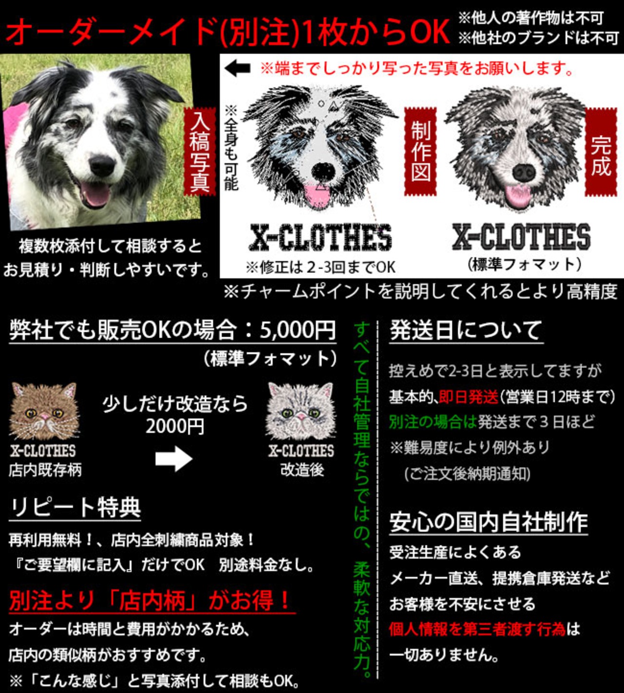 対応刺繍一覧:X-CLOTHES 1 2 3 4 5 6 7 8 9 野鳥 イワトビペンギン ウグイス オオハシ鳥 オカメインコ コザクラインコ シルバー文鳥 セキセイインコ ボタンインコ メジロ 桜文鳥 雀 白文鳥 文鳥 ヤマショウビン スコティッシュフォールド ラグドール ハチワレ猫 ベンガル 犬 柴犬白 ドーベルマン ブルドック フレンチブルドッグ マルチーズ ラブラドール 柴犬 人物 弁慶 ナポレオン 伊達政宗 関羽 侍 上杉謙信 織田信長 真田幸村 武田信玄 鳥獣戯画 ウサギ カエル サル 動物 ハリネズミ 龍 食べ物 うどん そば 乗り物 トラクター バイク 車 箱根登山鉄道1002形 昆虫 トンボ ユリシス蝶 魚類 マダイ ミナミハコフグ 海老 出目金 花 ひまわり 日本伝統模様 丸に千鳥 五つ千鳥 光琳梅 市松花菱 七宝 ねじり梅 唐草 丸に麻の葉 浪輪に陰千鳥 浮世絵 富士山 すずめ スズメ 魚 電車 蕎麦 戦国武将 名人 鳥獣戯画 浮世絵 オニオオハシ 紅冠鳥 キジトラ猫 ロシアンブルー 茶トラ猫 マヌルネコ シェパード チワワ トイプードル パグ ボーダーコリー ボストンテリア ミニチュアダックス ラッセルテリア エゾモモンガ カエル キリン キンクマハムスター ゴールデンハムスター フトアゴヒゲトカゲ
