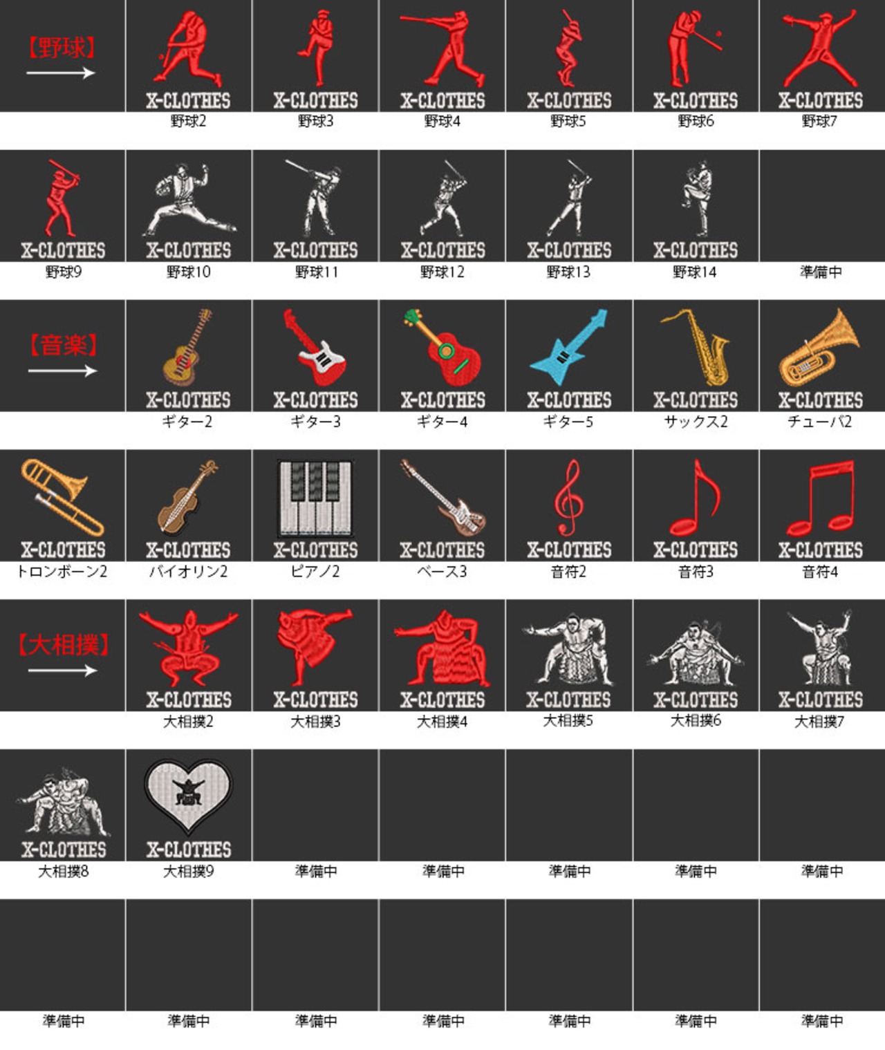 X-CLOTHES 競技音楽一覧:けん玉 アメフト キックボクシング ギター ゴルフ サッカー サックス サーフィン スキー スケートボード スノーボード ダンス ダーツ チューバ テニス トロンボーン ドッチボール ハンドボール バイオリン バスケ バドミントン バレエ バレーボール ピアノ フィギュアスケート フラガール ベース ボクシング ボーリング マラソン ムエタイ ヨガ ラグビー ラケット 体操 剣道 卓球 和太鼓 囲碁 大相撲 居合 弓道 柔道 歌舞伎 水泳 水球 白連獅子 白連獅子毛振り 空手 競艇 競輪 競馬 茶道 西馬音内盆踊り 赤連獅子 赤連獅子毛振り 越中おわら踊り 郡上踊り 野球 釣り 阿波踊り 陸上 陸上走り 音符 麻雀-発 1 2 3 4 5 6 7 8 9 0