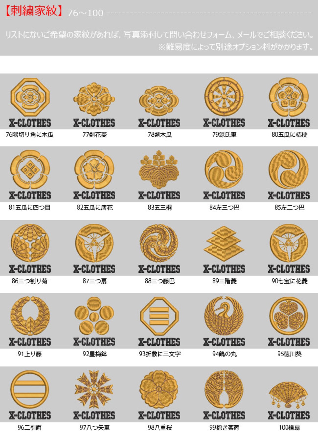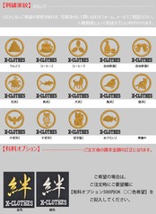 対応刺繍一覧:X-CLOTHES 伊達政宗 檜扇 違い矢 井桁 右重ね違い鷹の羽 下がり藤 花菱 割り菱 鬼蔦 亀甲に花菱 安藤藤 桔梗 橘 九つ星 九枚笹 九曜 隅立て四つ目 剣花菱 剣三つ柏 剣片喰 五瓜に唐花 庵木瓜 五三桐 五本骨扇 根笹 左三階松 笹竜胆 三つ引き 三つ星 三つ星に一の字 三つ柏 陰蔦 三つ鱗 三階菱 四つ目菱 四方剣花菱 四方木瓜 七つ星 十字 松皮菱 上の字 尻合わせ三つ蔦 右三つ巴 星梅鉢 中陰蔦 蔦 釘抜き 渡辺星 日の丸扇 梅の花 梅鉢 平四つ目 並び鷹の羽 5右二つ巴 並び矢 変わり揚羽蝶 片喰 抱き沢瀉 抱き柏 抱き茗荷 蔓柏 木瓜 揚羽蝶 立ち梶の葉 下がり藤 立ち沢瀉 亀甲花菱 菊水 九曜 隅切り角に木瓜 剣花菱 剣木瓜 源氏車 違い鷹の羽 五瓜に桔梗 五瓜に四つ目 唐花 五三桐 左 三つ割り菊 扇 藤巴 三階菱 違い丁子 七宝に花菱 上り藤 星梅鉢 折敷に三文字 鶴の丸 徳川葵 二引両 八つ矢車 八重桜 抱き茗荷 違い柏 うんこ コーヒー めでたい 花 菊の紋章 魚 犬 派 斎藤道三 坂本龍馬 自由飲酒 党 招き猫 上杉氏 陣旗 毘 龍 織田信長 真田幸村 西郷隆盛 石田三成 大谷吉継 鳥 徳川家康 猫派 不苦労 武田信玄 豊臣秀吉-五七桐 太閤桐 明智光秀 毛利家 丸に