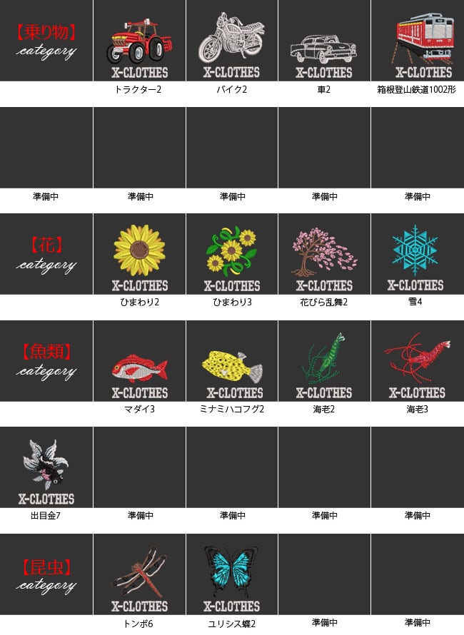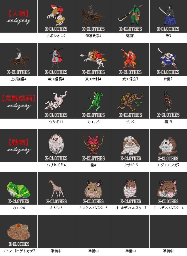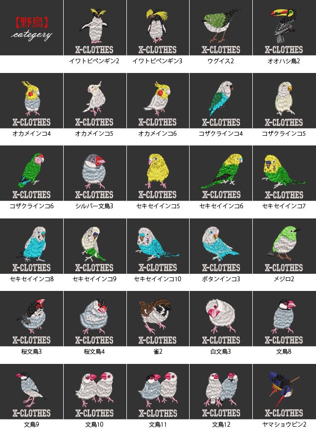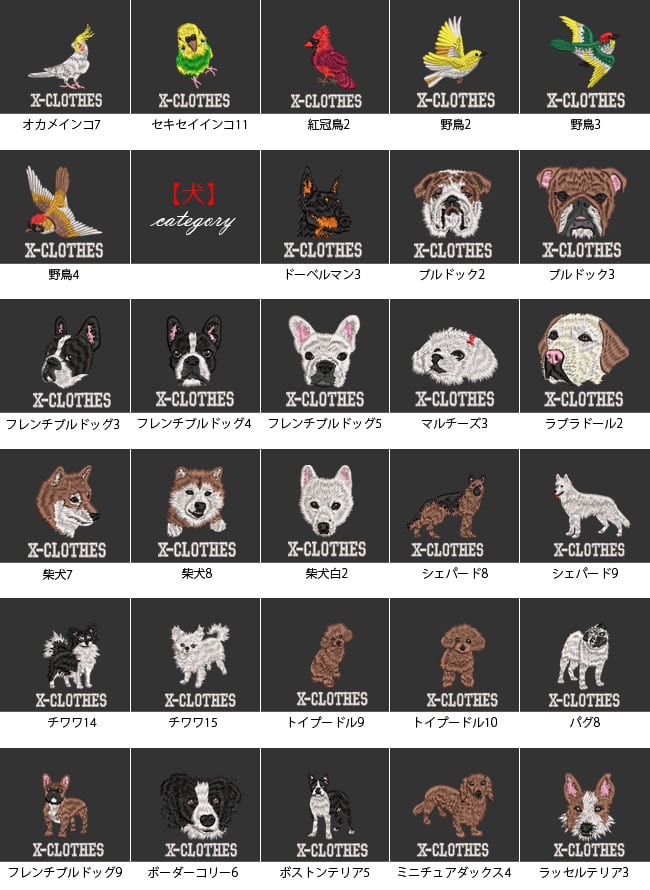 対応刺繍一覧:X-CLOTHES 1 2 3 4 5 6 7 8 9 野鳥 イワトビペンギン ウグイス オオハシ鳥 オカメインコ コザクラインコ シルバー文鳥 セキセイインコ ボタンインコ メジロ 桜文鳥 雀 白文鳥 文鳥 ヤマショウビン スコティッシュフォールド ラグドール ハチワレ猫 ベンガル 犬 柴犬白 ドーベルマン ブルドック フレンチブルドッグ マルチーズ ラブラドール 柴犬 人物 弁慶 ナポレオン 伊達政宗 関羽 侍 上杉謙信 織田信長 真田幸村 武田信玄 鳥獣戯画 ウサギ カエル サル 動物 ハリネズミ 龍 食べ物 うどん そば 乗り物 トラクター バイク 車 箱根登山鉄道1002形 昆虫 トンボ ユリシス蝶 魚類 マダイ ミナミハコフグ 海老 出目金 花 ひまわり 日本伝統模様 丸に千鳥 五つ千鳥 光琳梅 市松花菱 七宝 ねじり梅 唐草 丸に麻の葉 浪輪に陰千鳥 浮世絵 富士山 すずめ スズメ 魚 電車 蕎麦 戦国武将 名人 鳥獣戯画 浮世絵 オニオオハシ 紅冠鳥 キジトラ猫 ロシアンブルー 茶トラ猫 マヌルネコ シェパード チワワ トイプードル パグ ボーダーコリー ボストンテリア ミニチュアダックス ラッセルテリア エゾモモンガ カエル キリン キンクマハムスター ゴールデンハムスター フトアゴヒゲトカゲ