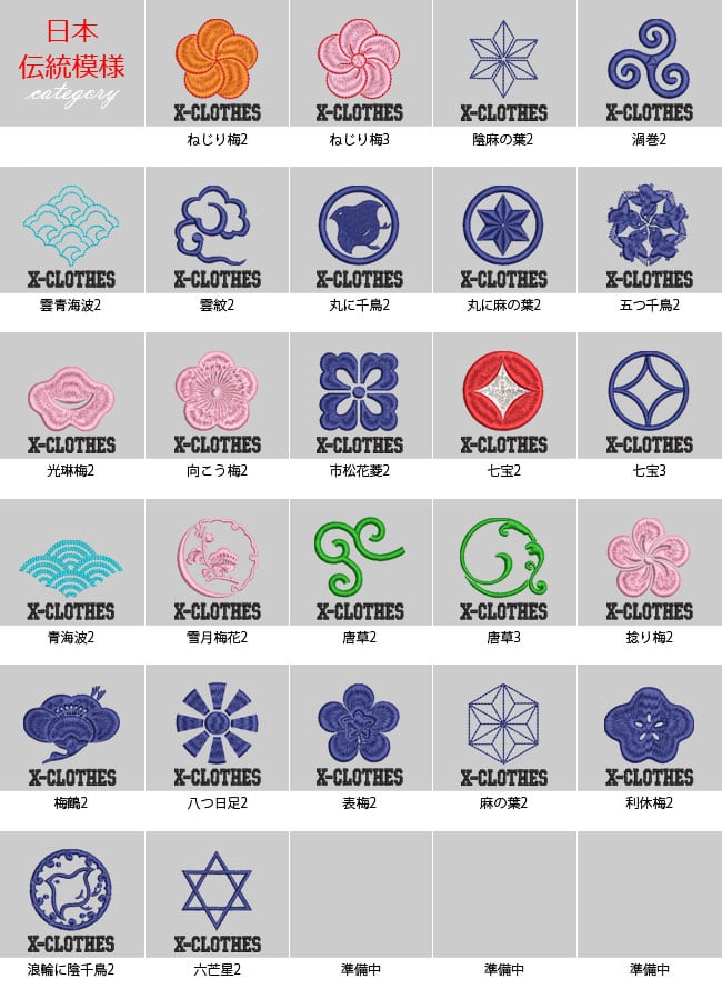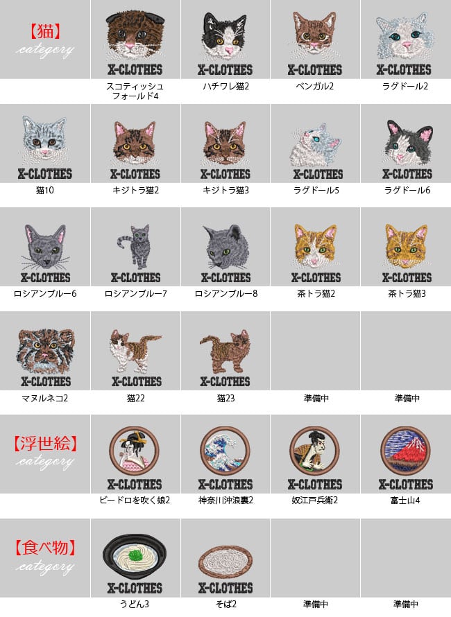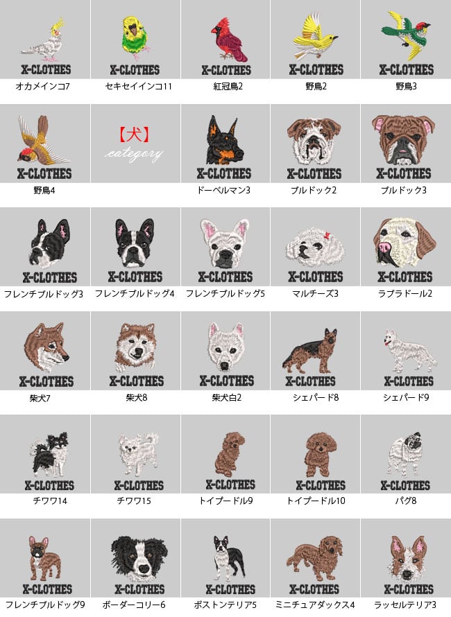 対応刺繍一覧:X-CLOTHES 1 2 3 4 5 6 7 8 9 野鳥 イワトビペンギン ウグイス オオハシ鳥 オカメインコ コザクラインコ シルバー文鳥 セキセイインコ ボタンインコ メジロ 桜文鳥 雀 白文鳥 文鳥 ヤマショウビン スコティッシュフォールド ラグドール ハチワレ猫 ベンガル 犬 柴犬白 ドーベルマン ブルドック フレンチブルドッグ マルチーズ ラブラドール 柴犬 人物 弁慶 ナポレオン 伊達政宗 関羽 侍 上杉謙信 織田信長 真田幸村 武田信玄 鳥獣戯画 ウサギ カエル サル 動物 ハリネズミ 龍 食べ物 うどん そば 乗り物 トラクター バイク 車 箱根登山鉄道1002形 昆虫 トンボ ユリシス蝶 魚類 マダイ ミナミハコフグ 海老 出目金 花 ひまわり 日本伝統模様 丸に千鳥 五つ千鳥 光琳梅 市松花菱 七宝 ねじり梅 唐草 丸に麻の葉 浪輪に陰千鳥 浮世絵 富士山 すずめ スズメ 魚 電車 蕎麦 戦国武将 名人 鳥獣戯画 浮世絵 オニオオハシ 紅冠鳥 キジトラ猫 ロシアンブルー 茶トラ猫 マヌルネコ シェパード チワワ トイプードル パグ ボーダーコリー ボストンテリア ミニチュアダックス ラッセルテリア エゾモモンガ カエル キリン キンクマハムスター ゴールデンハムスター フトアゴヒゲトカゲ