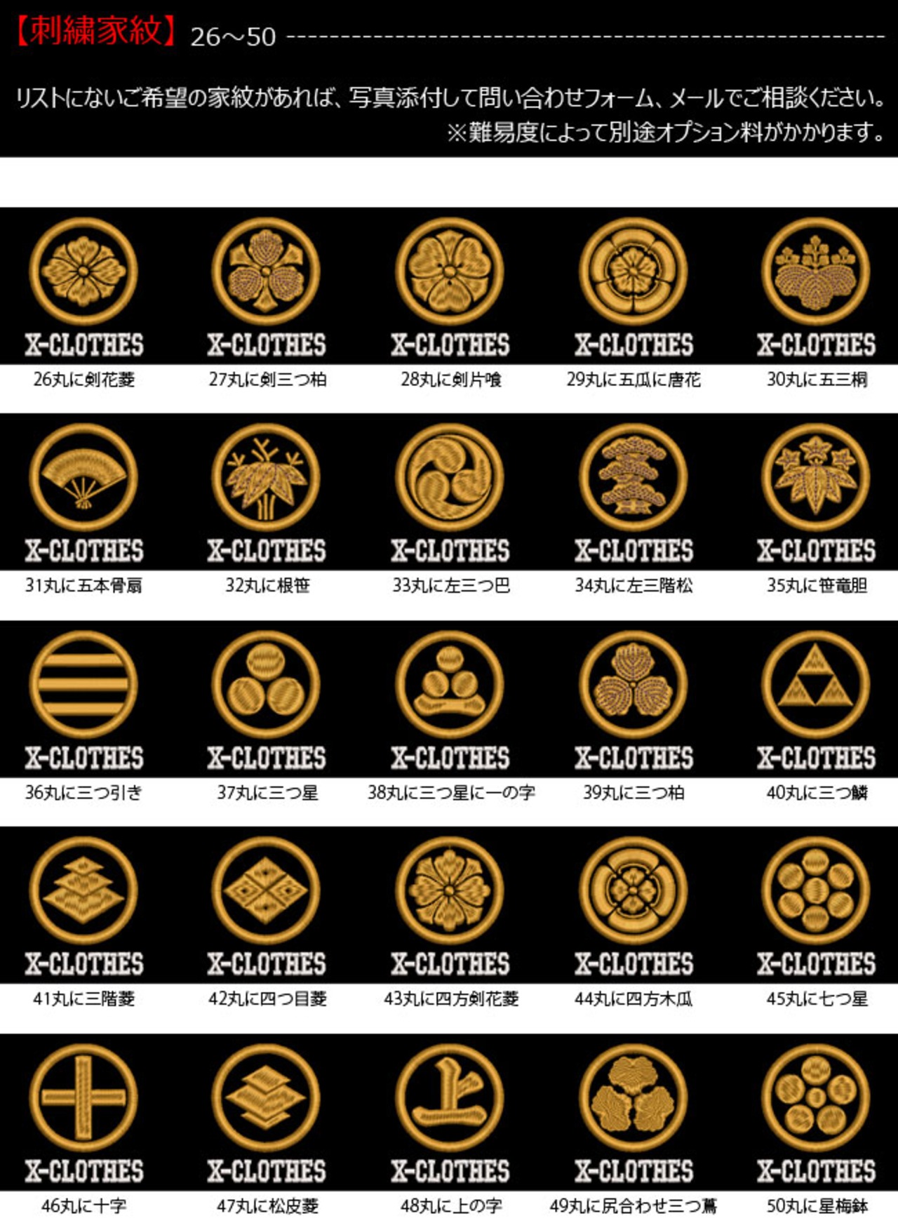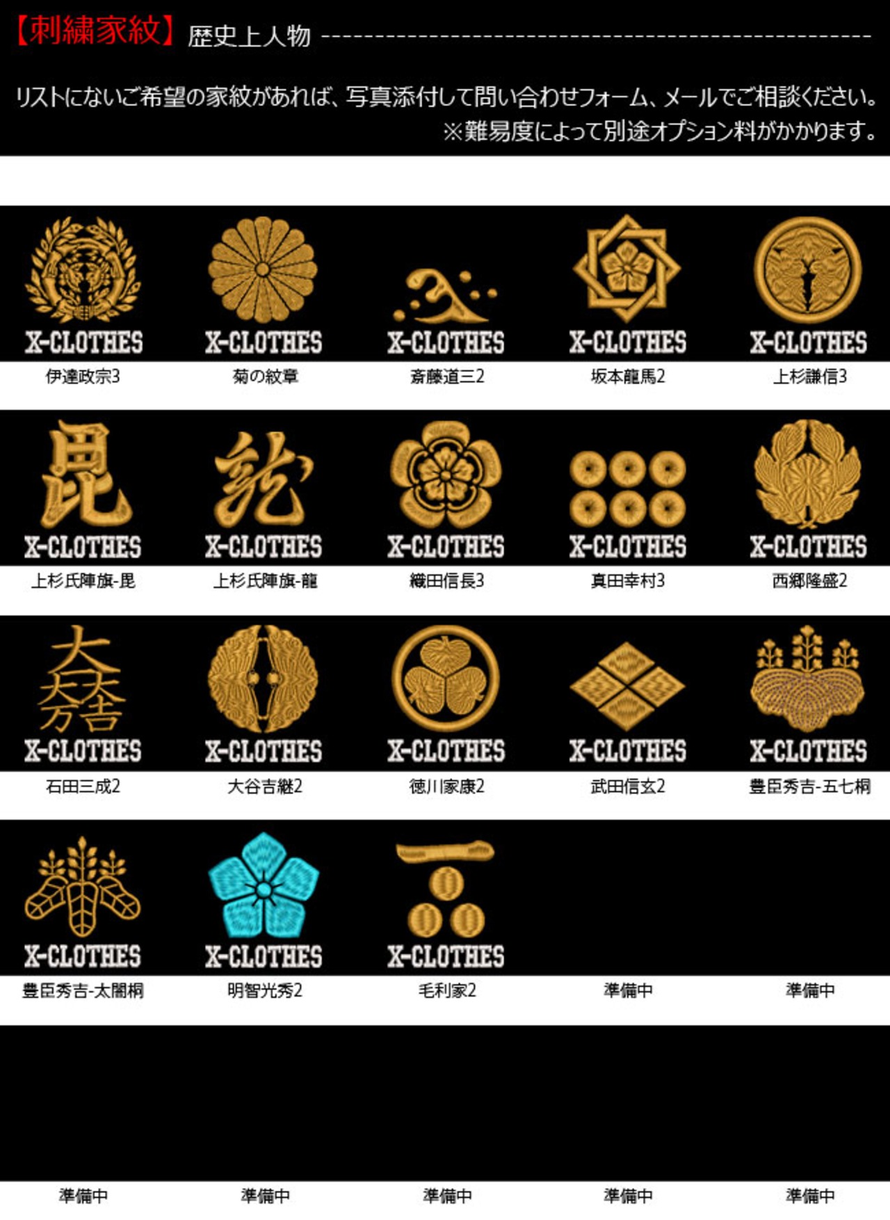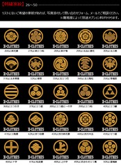 対応刺繍一覧:X-CLOTHES 伊達政宗 檜扇 違い矢 井桁 右重ね違い鷹の羽 下がり藤 花菱 割り菱 鬼蔦 亀甲に花菱 安藤藤 桔梗 橘 九つ星 九枚笹 九曜 隅立て四つ目 剣花菱 剣三つ柏 剣片喰 五瓜に唐花 庵木瓜 五三桐 五本骨扇 根笹 左三階松 笹竜胆 三つ引き 三つ星 三つ星に一の字 三つ柏 陰蔦 三つ鱗 三階菱 四つ目菱 四方剣花菱 四方木瓜 七つ星 十字 松皮菱 上の字 尻合わせ三つ蔦 右三つ巴 星梅鉢 中陰蔦 蔦 釘抜き 渡辺星 日の丸扇 梅の花 梅鉢 平四つ目 並び鷹の羽 5右二つ巴 並び矢 変わり揚羽蝶 片喰 抱き沢瀉 抱き柏 抱き茗荷 蔓柏 木瓜 揚羽蝶 立ち梶の葉 下がり藤 立ち沢瀉 亀甲花菱 菊水 九曜 隅切り角に木瓜 剣花菱 剣木瓜 源氏車 違い鷹の羽 五瓜に桔梗 五瓜に四つ目 唐花 五三桐 左 三つ割り菊 扇 藤巴 三階菱 違い丁子 七宝に花菱 上り藤 星梅鉢 折敷に三文字 鶴の丸 徳川葵 二引両 八つ矢車 八重桜 抱き茗荷 違い柏 うんこ コーヒー めでたい 花 菊の紋章 魚 犬 派 斎藤道三 坂本龍馬 自由飲酒 党 招き猫 上杉氏 陣旗 毘 龍 織田信長 真田幸村 西郷隆盛 石田三成 大谷吉継 鳥 徳川家康 猫派 不苦労 武田信玄 豊臣秀吉-五七桐 太閤桐 明智光秀 毛利家 丸に
