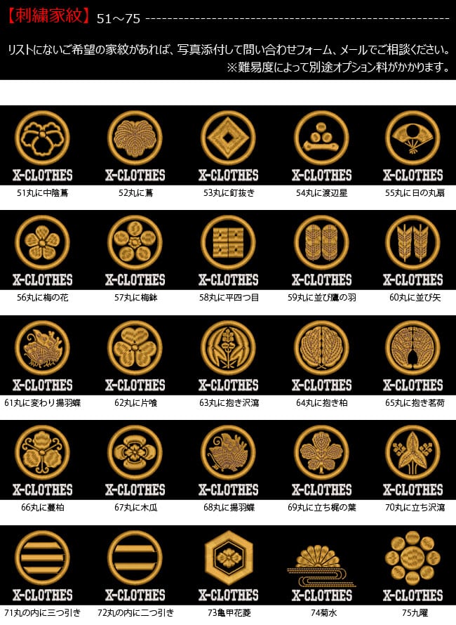 対応刺繍一覧:X-CLOTHES 伊達政宗 檜扇 違い矢 井桁 右重ね違い鷹の羽 下がり藤 花菱 割り菱 鬼蔦 亀甲に花菱 安藤藤 桔梗 橘 九つ星 九枚笹 九曜 隅立て四つ目 剣花菱 剣三つ柏 剣片喰 五瓜に唐花 庵木瓜 五三桐 五本骨扇 根笹 左三階松 笹竜胆 三つ引き 三つ星 三つ星に一の字 三つ柏 陰蔦 三つ鱗 三階菱 四つ目菱 四方剣花菱 四方木瓜 七つ星 十字 松皮菱 上の字 尻合わせ三つ蔦 右三つ巴 星梅鉢 中陰蔦 蔦 釘抜き 渡辺星 日の丸扇 梅の花 梅鉢 平四つ目 並び鷹の羽 5右二つ巴 並び矢 変わり揚羽蝶 片喰 抱き沢瀉 抱き柏 抱き茗荷 蔓柏 木瓜 揚羽蝶 立ち梶の葉 下がり藤 立ち沢瀉 亀甲花菱 菊水 九曜 隅切り角に木瓜 剣花菱 剣木瓜 源氏車 違い鷹の羽 五瓜に桔梗 五瓜に四つ目 唐花 五三桐 左 三つ割り菊 扇 藤巴 三階菱 違い丁子 七宝に花菱 上り藤 星梅鉢 折敷に三文字 鶴の丸 徳川葵 二引両 八つ矢車 八重桜 抱き茗荷 違い柏 うんこ コーヒー めでたい 花 菊の紋章 魚 犬 派 斎藤道三 坂本龍馬 自由飲酒 党 招き猫 上杉氏 陣旗 毘 龍 織田信長 真田幸村 西郷隆盛 石田三成 大谷吉継 鳥 徳川家康 猫派 不苦労 武田信玄 豊臣秀吉-五七桐 太閤桐 明智光秀 毛利家 丸に