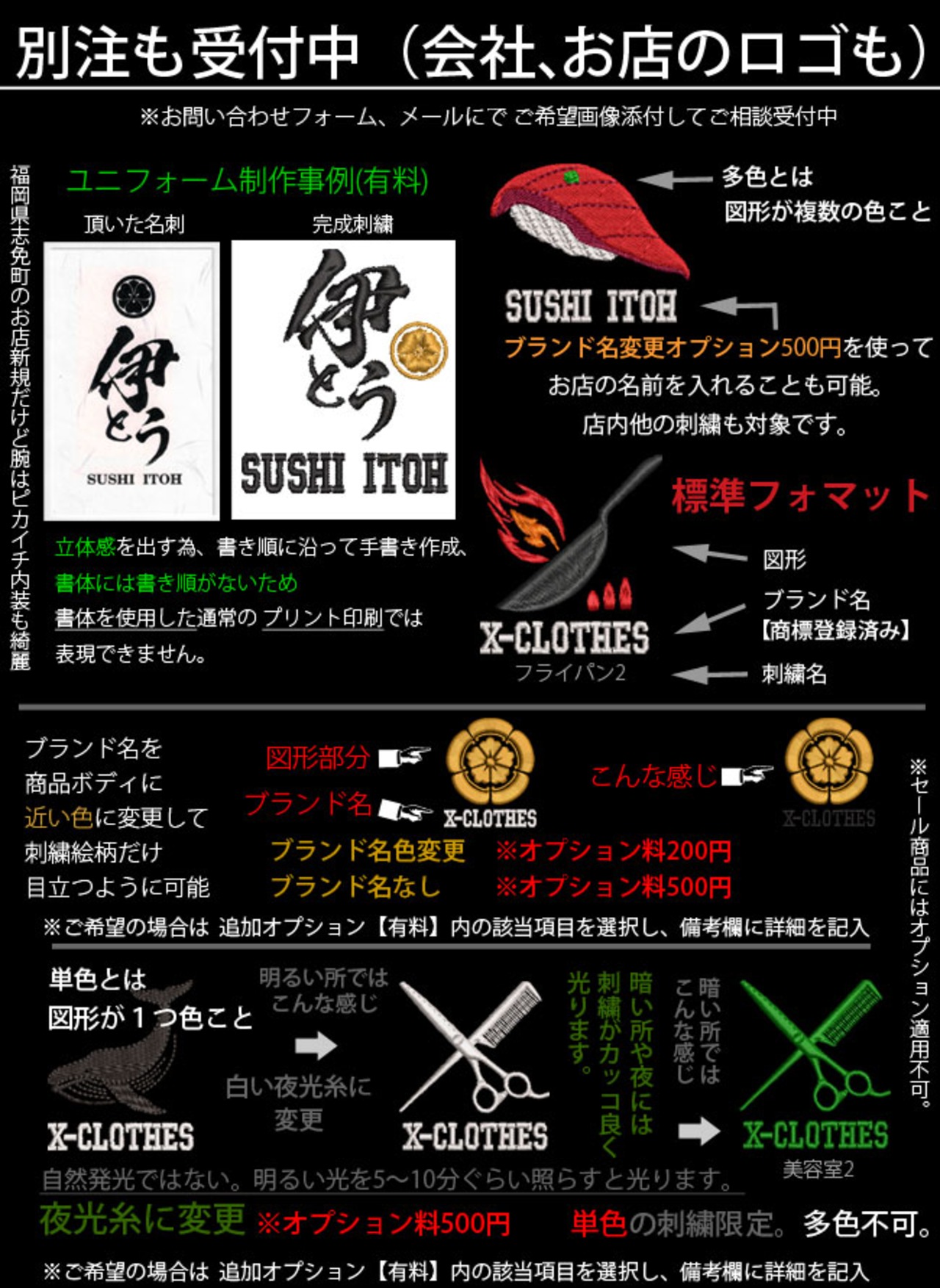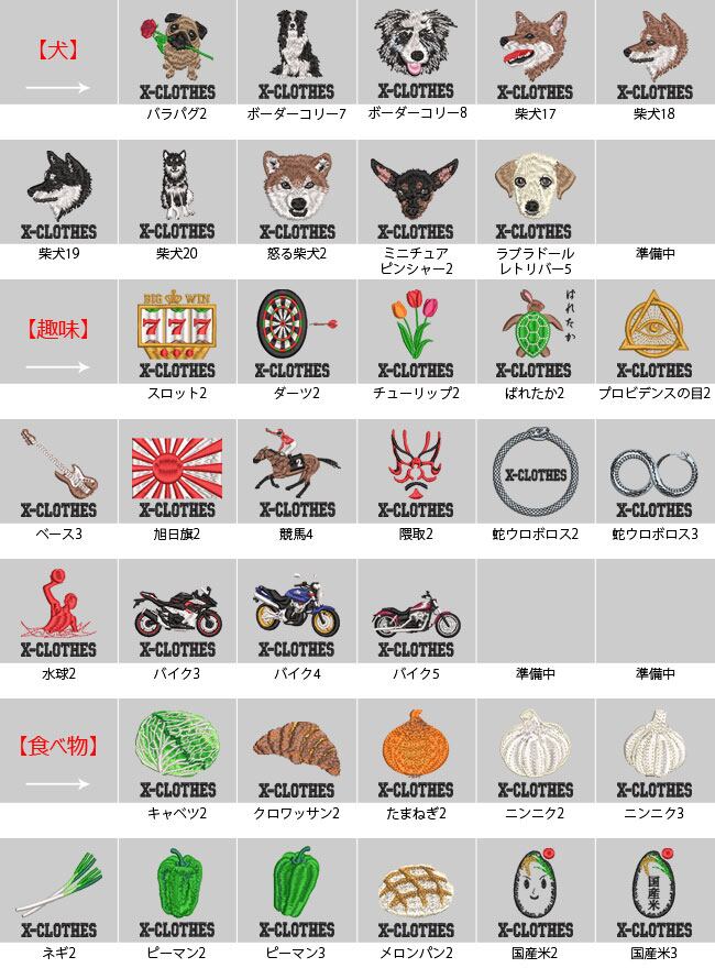 対応刺繍一覧:X-CLOTHES アイナメ アオリイカ アカハタ アカメバル イトウ オジサン オニカサゴ カワハギ カンパチ キジハタ シロギス キンメダイ クエ クロダイ サケ シーバス シマアジ カメ セマルハコガメ トラフグ ナマズ ニジマス ハリセンボン ヒラマサ ヒラメ ブラックバス ブリ マアジ マゴチ 跳ねる ハート魚 日の丸魚 鯛 バラパグ ボーダーコリー 柴犬 怒る ミニチュア ピンシャー ラブラドール レトリバー スロット ダーツ チューリップ ばれたか プロビデンスの目 ベース 旭日旗 競馬 隈取 蛇ウロボロス 水球 バイク キャベツ クロワッサン たまねぎ ニンニク ネギ ピーマン メロンパン 国産米 ウサギ かかってこい シーサー ハリネズミ 祈りナマケモノ マーモット 恐竜化石 見ざる 言わざる 聞かざる 子豚 狼 蜈蚣 印鑑 シャー ロシアンブルー ハチワレ 黒猫 白猫 ホシガラス 鴨 雷鳥 還暦 古希 喜寿 傘寿 米寿 卒寿 白寿 無限 アインシュタイン サンタクロース セクシーガール チェゲバラ ひょっとこ 鬼丸 宮本武蔵 恵比寿天 佐々木小次郎 坂本龍馬 死神 小面 織田信長 青鬼 赤鬼 大黒天 徳川家康 能面翁 般若 豊臣秀吉 干支 1 2 3 4 5 6 7 8 9 0 イニシャル 名字族