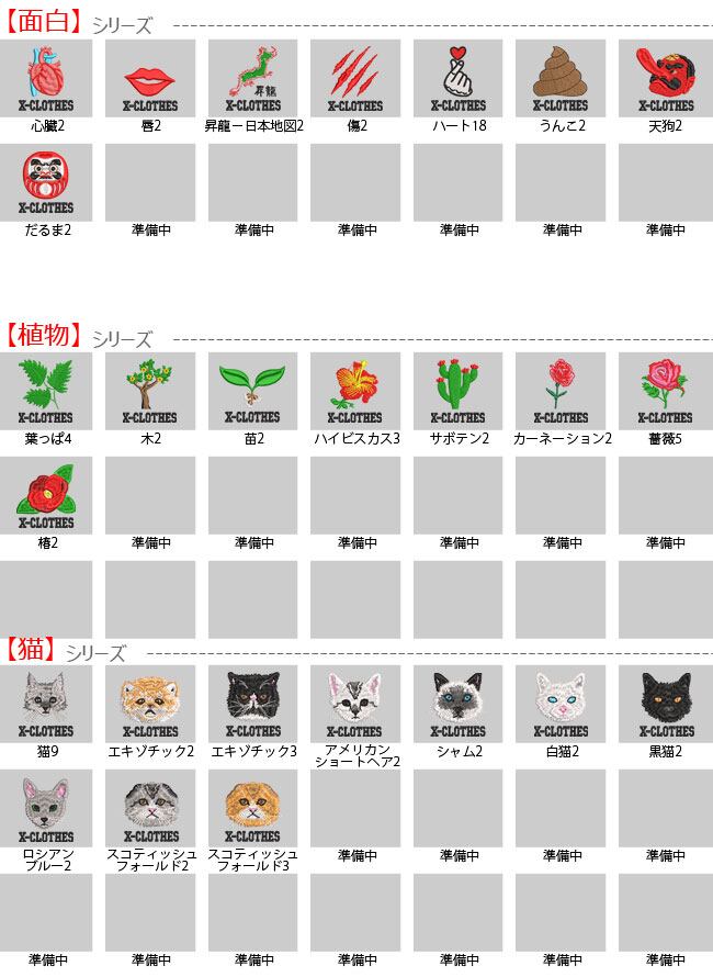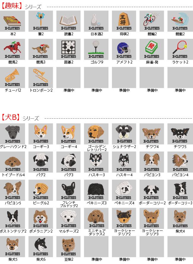 対応刺繍一覧:X-CLOTHES 兜 直江兼続 ローマ 伊達政宗 源義経 上杉謙信 織田信長 真田幸村 関羽 金魚 カニ 柴犬 ゴードンセッター サモエド ダックスフント トイプードル ドーベルマン ハスキー バセット パピヨン ペキニーズ ロットワイラー 柴犬 狆 チワワ キャバリア グレートデーン コーギー シーズー 秋田犬 ダルメシアン トイテリア スパニエル ラッセルテリア シェパード パグ ハスキー ビーグル フレンチブルドッグ ボーダーコリー ボストンテリア ポメラニアン マルチーズ ミニチュアダックス ヨークシャーテリア 豆柴 グレーハウンド ゴールデンレトリバー シュナウザー チューバ トロンボーン 囲碁 競艇 競馬 競輪 将棋 日本酒 アメフト テニス カーネーション おにぎり オムレツ キュウリ トマト ビール ブロッコリー もつ鍋 ラーメン 寿司 焼き鳥 焼肉 桃 目玉焼き 餃子 鳳凰 インコ カワセミ コザクラ セキセイ フクロウ ペンギン 鷹 ボタン マメルリハ 桜 文鳥 オカメ コザクラ シルバー ハシビロコウ カンガルー コアラ ボスゴリラ 恐竜 ハムスター パンダ ユニコン 牛 虎 子豚 カメ 狼 ライオン うさぎ モモンガ レッサー 龍 アルパカ カワウソ チンチラ 猫 黒 白 馬