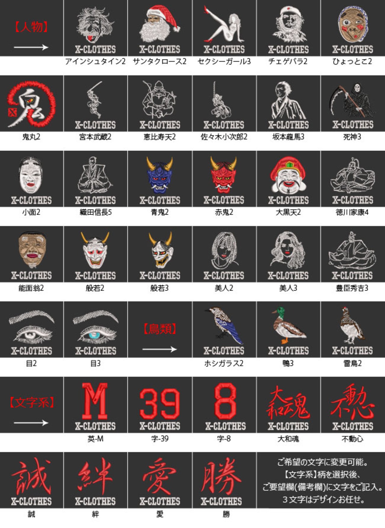 対応刺繍一覧:X-CLOTHES アイナメ アオリイカ アカハタ アカメバル イトウ オジサン オニカサゴ カワハギ カンパチ キジハタ シロギス キンメダイ クエ クロダイ サケ シーバス シマアジ カメ セマルハコガメ トラフグ ナマズ ニジマス ハリセンボン ヒラマサ ヒラメ ブラックバス ブリ マアジ マゴチ 跳ねる ハート魚 日の丸魚 鯛 バラパグ ボーダーコリー 柴犬 怒る ミニチュア ピンシャー ラブラドール レトリバー スロット ダーツ チューリップ ばれたか プロビデンスの目 ベース 旭日旗 競馬 隈取 蛇ウロボロス 水球 バイク キャベツ クロワッサン たまねぎ ニンニク ネギ ピーマン メロンパン 国産米 ウサギ かかってこい シーサー ハリネズミ 祈りナマケモノ マーモット 恐竜化石 見ざる 言わざる 聞かざる 子豚 狼 蜈蚣 印鑑 シャー ロシアンブルー ハチワレ 黒猫 白猫 ホシガラス 鴨 雷鳥 還暦 古希 喜寿 傘寿 米寿 卒寿 白寿 無限 アインシュタイン サンタクロース セクシーガール チェゲバラ ひょっとこ 鬼丸 宮本武蔵 恵比寿天 佐々木小次郎 坂本龍馬 死神 小面 織田信長 青鬼 赤鬼 大黒天 徳川家康 能面翁 般若 豊臣秀吉 干支 1 2 3 4 5 6 7 8 9 0 イニシャル 名字族