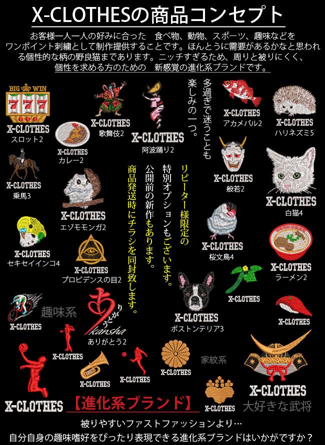 対応刺繍一覧:X-CLOTHES おもしろ文字 四文字熟語 X-CLOTHES アホ イケ麺 うんこ げん気 パンだ ひじき もやし やる気 らーめん 愛妻家 飲酒党 俺可愛 花粉症 感謝 甘党 還暦 鬼だ 鬼嫁 激やせ 限界 故障中 好き 幸せ 腰痛 最強 妻 雑草 侍 修業中 傷 少食 笑顔 神だ2 神だ3 辛党 草食 大福 断酒 釣人 天然 特攻 毒舌 豚豚 肉食 忍 燃料酒 薄毛 爆釣り 美人 姫 夫 福 変体 褒のび 褒めて 凡人夢なし 無敵 無力 妄想族 妄想中 勇者 老春 餃子 卒団 記念品 部活 卒業 鬼 あらまニャン お疲れパン カタツムリ カンフーニャン カンフーニャン デブワン なになにワン ハエ びっくりニャン レッサーパンダ 雨カエル 何してるニャン 何見てるワン 画家ナマケモノ 嬉しいワン 機嫌悪ワン 見つめる猫 見るなワン 幸うんだワン 考カエル 真犯人ワン 怒るニャン 動けないニャン 不機嫌ニャン 食べ物 ー カレー たんぽぽ トビウオ とんかつ 海老 茶道 唐揚げ 辛神 徳川家康 忍者 風神 雷神 柴犬 猫 ペキニーズ