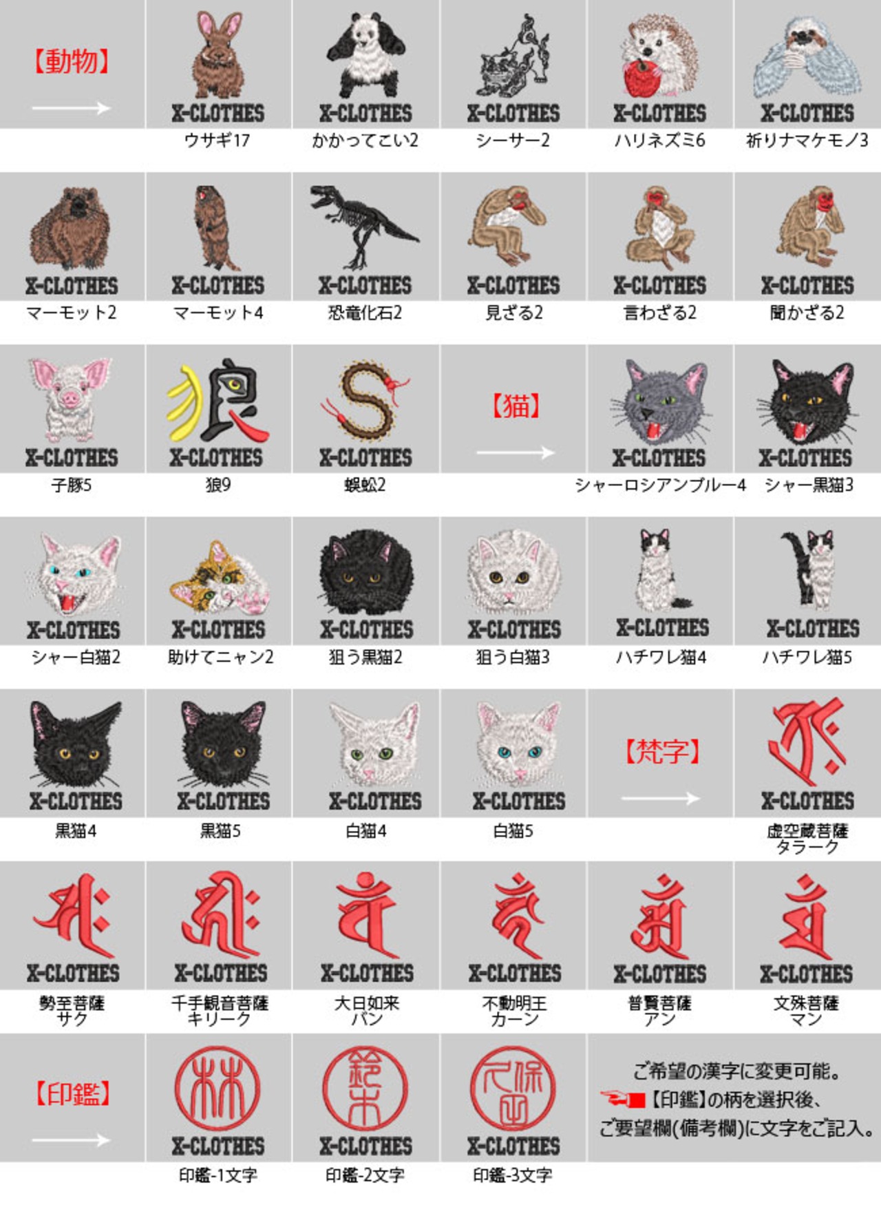 対応刺繍一覧:X-CLOTHES アイナメ アオリイカ アカハタ アカメバル イトウ オジサン オニカサゴ カワハギ カンパチ キジハタ シロギス キンメダイ クエ クロダイ サケ シーバス シマアジ カメ セマルハコガメ トラフグ ナマズ ニジマス ハリセンボン ヒラマサ ヒラメ ブラックバス ブリ マアジ マゴチ 跳ねる ハート魚 日の丸魚 鯛 バラパグ ボーダーコリー 柴犬 怒る ミニチュア ピンシャー ラブラドール レトリバー スロット ダーツ チューリップ ばれたか プロビデンスの目 ベース 旭日旗 競馬 隈取 蛇ウロボロス 水球 バイク キャベツ クロワッサン たまねぎ ニンニク ネギ ピーマン メロンパン 国産米 ウサギ かかってこい シーサー ハリネズミ 祈りナマケモノ マーモット 恐竜化石 見ざる 言わざる 聞かざる 子豚 狼 蜈蚣 印鑑 シャー ロシアンブルー ハチワレ 黒猫 白猫 ホシガラス 鴨 雷鳥 還暦 古希 喜寿 傘寿 米寿 卒寿 白寿 無限 アインシュタイン サンタクロース セクシーガール チェゲバラ ひょっとこ 鬼丸 宮本武蔵 恵比寿天 佐々木小次郎 坂本龍馬 死神 小面 織田信長 青鬼 赤鬼 大黒天 徳川家康 能面翁 般若 豊臣秀吉 干支 1 2 3 4 5 6 7 8 9 0 イニシャル 名字族