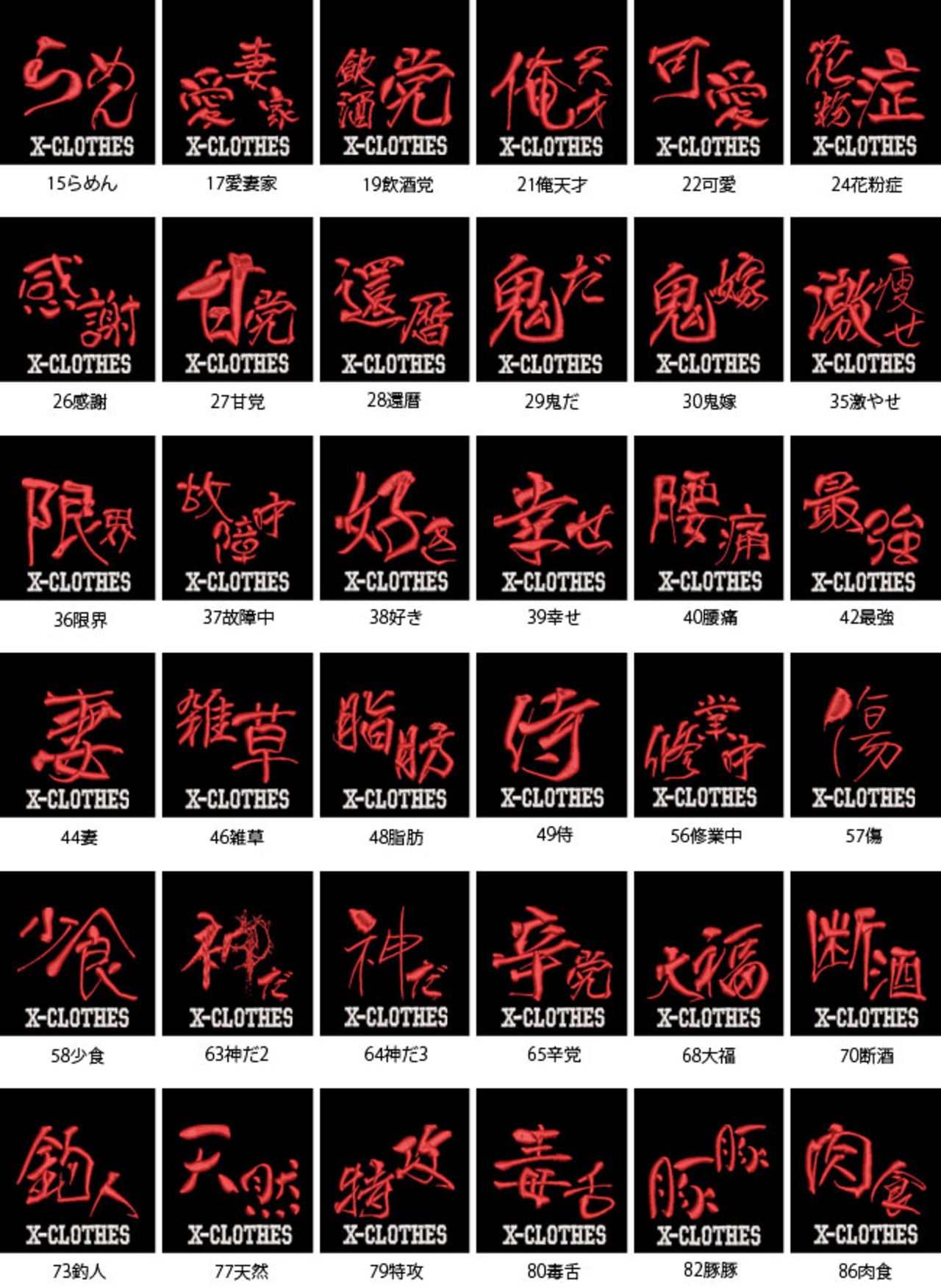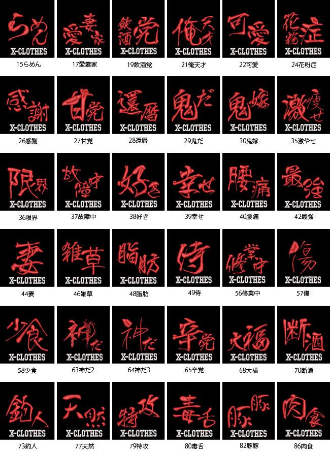 対応刺繍一覧:X-CLOTHES おもしろ文字 四文字熟語 X-CLOTHES アホ イケ麺 うんこ げん気 パンだ ひじき もやし やる気 らーめん 愛妻家 飲酒党 俺可愛 花粉症 感謝 甘党 還暦 鬼だ 鬼嫁 激やせ 限界 故障中 好き 幸せ 腰痛 最強 妻 雑草 侍 修業中 傷 少食 笑顔 神だ2 神だ3 辛党 草食 大福 断酒 釣人 天然 特攻 毒舌 豚豚 肉食 忍 燃料酒 薄毛 爆釣り 美人 姫 夫 福 変体 褒のび 褒めて 凡人夢なし 無敵 無力 妄想族 妄想中 勇者 老春 餃子 卒団 記念品 部活 卒業 鬼 あらまニャン お疲れパン カタツムリ カンフーニャン カンフーニャン デブワン なになにワン ハエ びっくりニャン レッサーパンダ 雨カエル 何してるニャン 何見てるワン 画家ナマケモノ 嬉しいワン 機嫌悪ワン 見つめる猫 見るなワン 幸うんだワン 考カエル 真犯人ワン 怒るニャン 動けないニャン 不機嫌ニャン 食べ物 ー カレー たんぽぽ トビウオ とんかつ 海老 茶道 唐揚げ 辛神 徳川家康 忍者 風神 雷神 柴犬 猫 ペキニーズ