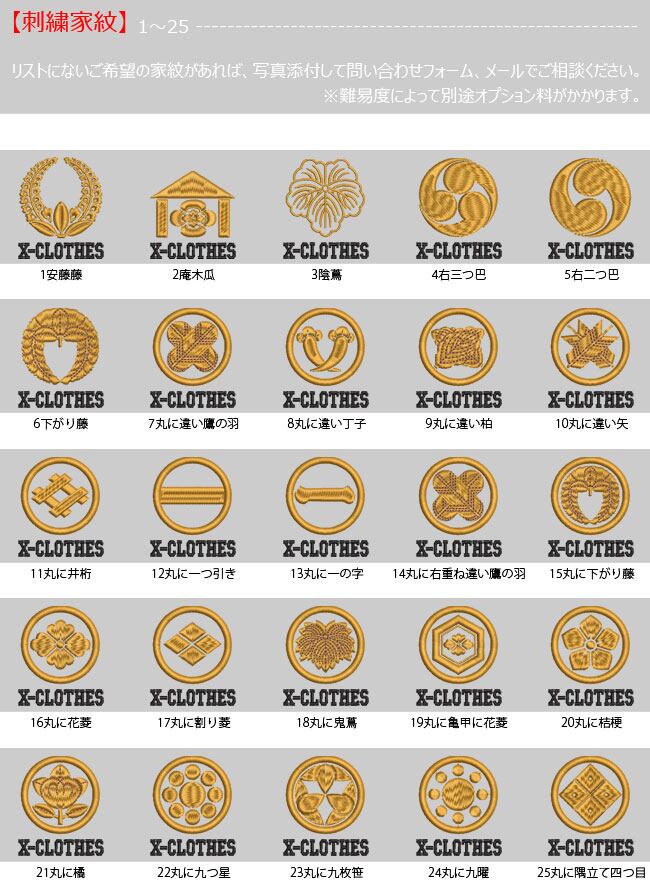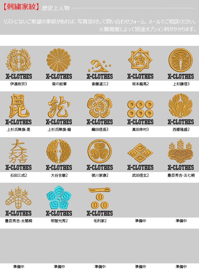 対応刺繍一覧:X-CLOTHES 伊達政宗 檜扇 違い矢 井桁 右重ね違い鷹の羽 下がり藤 花菱 割り菱 鬼蔦 亀甲に花菱 安藤藤 桔梗 橘 九つ星 九枚笹 九曜 隅立て四つ目 剣花菱 剣三つ柏 剣片喰 五瓜に唐花 庵木瓜 五三桐 五本骨扇 根笹 左三階松 笹竜胆 三つ引き 三つ星 三つ星に一の字 三つ柏 陰蔦 三つ鱗 三階菱 四つ目菱 四方剣花菱 四方木瓜 七つ星 十字 松皮菱 上の字 尻合わせ三つ蔦 右三つ巴 星梅鉢 中陰蔦 蔦 釘抜き 渡辺星 日の丸扇 梅の花 梅鉢 平四つ目 並び鷹の羽 5右二つ巴 並び矢 変わり揚羽蝶 片喰 抱き沢瀉 抱き柏 抱き茗荷 蔓柏 木瓜 揚羽蝶 立ち梶の葉 下がり藤 立ち沢瀉 亀甲花菱 菊水 九曜 隅切り角に木瓜 剣花菱 剣木瓜 源氏車 違い鷹の羽 五瓜に桔梗 五瓜に四つ目 唐花 五三桐 左 三つ割り菊 扇 藤巴 三階菱 違い丁子 七宝に花菱 上り藤 星梅鉢 折敷に三文字 鶴の丸 徳川葵 二引両 八つ矢車 八重桜 抱き茗荷 違い柏 うんこ コーヒー めでたい 花 菊の紋章 魚 犬 派 斎藤道三 坂本龍馬 自由飲酒 党 招き猫 上杉氏 陣旗 毘 龍 織田信長 真田幸村 西郷隆盛 石田三成 大谷吉継 鳥 徳川家康 猫派 不苦労 武田信玄 豊臣秀吉-五七桐 太閤桐 明智光秀 毛利家 丸に
