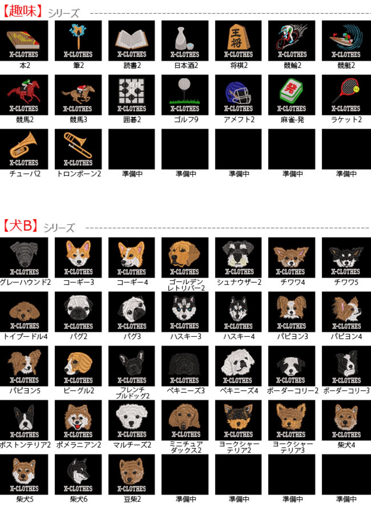 対応刺繍一覧:X-CLOTHES 兜 直江兼続 ローマ 伊達政宗 源義経 上杉謙信 織田信長 真田幸村 関羽 金魚 カニ 柴犬 ゴードンセッター サモエド ダックスフント トイプードル ドーベルマン ハスキー バセット パピヨン ペキニーズ ロットワイラー 柴犬 狆 チワワ キャバリア グレートデーン コーギー シーズー 秋田犬 ダルメシアン トイテリア スパニエル ラッセルテリア シェパード パグ ハスキー ビーグル フレンチブルドッグ ボーダーコリー ボストンテリア ポメラニアン マルチーズ ミニチュアダックス ヨークシャーテリア 豆柴 グレーハウンド ゴールデンレトリバー シュナウザー チューバ トロンボーン 囲碁 競艇 競馬 競輪 将棋 日本酒 アメフト テニス カーネーション おにぎり オムレツ キュウリ トマト ビール ブロッコリー もつ鍋 ラーメン 寿司 焼き鳥 焼肉 桃 目玉焼き 餃子 鳳凰 インコ カワセミ コザクラ セキセイ フクロウ ペンギン 鷹 ボタン マメルリハ 桜 文鳥 オカメ コザクラ シルバー ハシビロコウ カンガルー コアラ ボスゴリラ 恐竜 ハムスター パンダ ユニコン 牛 虎 子豚 カメ 狼 ライオン うさぎ モモンガ レッサー 龍 アルパカ カワウソ チンチラ 猫 黒 白 馬