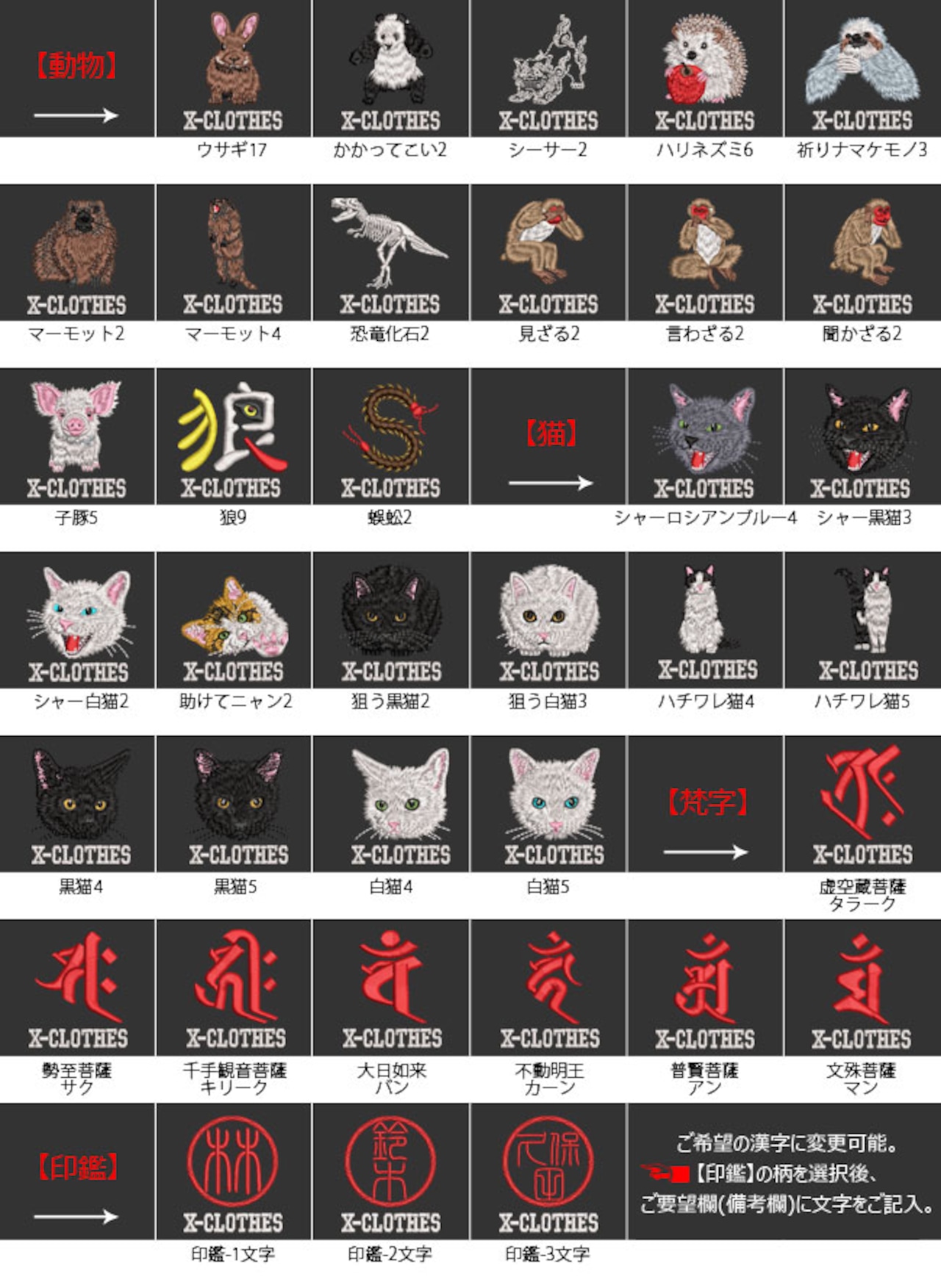 対応刺繍一覧:X-CLOTHES アイナメ アオリイカ アカハタ アカメバル イトウ オジサン オニカサゴ カワハギ カンパチ キジハタ シロギス キンメダイ クエ クロダイ サケ シーバス シマアジ カメ セマルハコガメ トラフグ ナマズ ニジマス ハリセンボン ヒラマサ ヒラメ ブラックバス ブリ マアジ マゴチ 跳ねる ハート魚 日の丸魚 鯛 バラパグ ボーダーコリー 柴犬 怒る ミニチュア ピンシャー ラブラドール レトリバー スロット ダーツ チューリップ ばれたか プロビデンスの目 ベース 旭日旗 競馬 隈取 蛇ウロボロス 水球 バイク キャベツ クロワッサン たまねぎ ニンニク ネギ ピーマン メロンパン 国産米 ウサギ かかってこい シーサー ハリネズミ 祈りナマケモノ マーモット 恐竜化石 見ざる 言わざる 聞かざる 子豚 狼 蜈蚣 印鑑 シャー ロシアンブルー ハチワレ 黒猫 白猫 ホシガラス 鴨 雷鳥 還暦 古希 喜寿 傘寿 米寿 卒寿 白寿 無限 アインシュタイン サンタクロース セクシーガール チェゲバラ ひょっとこ 鬼丸 宮本武蔵 恵比寿天 佐々木小次郎 坂本龍馬 死神 小面 織田信長 青鬼 赤鬼 大黒天 徳川家康 能面翁 般若 豊臣秀吉 干支 1 2 3 4 5 6 7 8 9 0 イニシャル 名字族