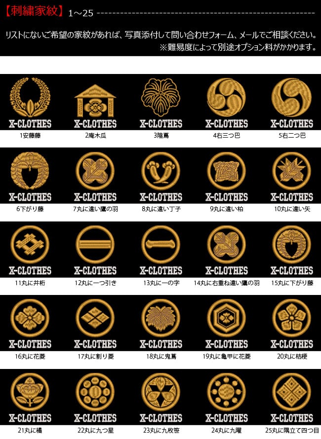 対応刺繍一覧:X-CLOTHES 伊達政宗 檜扇 違い矢 井桁 右重ね違い鷹の羽 下がり藤 花菱 割り菱 鬼蔦 亀甲に花菱 安藤藤 桔梗 橘 九つ星 九枚笹 九曜 隅立て四つ目 剣花菱 剣三つ柏 剣片喰 五瓜に唐花 庵木瓜 五三桐 五本骨扇 根笹 左三階松 笹竜胆 三つ引き 三つ星 三つ星に一の字 三つ柏 陰蔦 三つ鱗 三階菱 四つ目菱 四方剣花菱 四方木瓜 七つ星 十字 松皮菱 上の字 尻合わせ三つ蔦 右三つ巴 星梅鉢 中陰蔦 蔦 釘抜き 渡辺星 日の丸扇 梅の花 梅鉢 平四つ目 並び鷹の羽 5右二つ巴 並び矢 変わり揚羽蝶 片喰 抱き沢瀉 抱き柏 抱き茗荷 蔓柏 木瓜 揚羽蝶 立ち梶の葉 下がり藤 立ち沢瀉 亀甲花菱 菊水 九曜 隅切り角に木瓜 剣花菱 剣木瓜 源氏車 違い鷹の羽 五瓜に桔梗 五瓜に四つ目 唐花 五三桐 左 三つ割り菊 扇 藤巴 三階菱 違い丁子 七宝に花菱 上り藤 星梅鉢 折敷に三文字 鶴の丸 徳川葵 二引両 八つ矢車 八重桜 抱き茗荷 違い柏 うんこ コーヒー めでたい 花 菊の紋章 魚 犬 派 斎藤道三 坂本龍馬 自由飲酒 党 招き猫 上杉氏 陣旗 毘 龍 織田信長 真田幸村 西郷隆盛 石田三成 大谷吉継 鳥 徳川家康 猫派 不苦労 武田信玄 豊臣秀吉-五七桐 太閤桐 明智光秀 毛利家 丸に