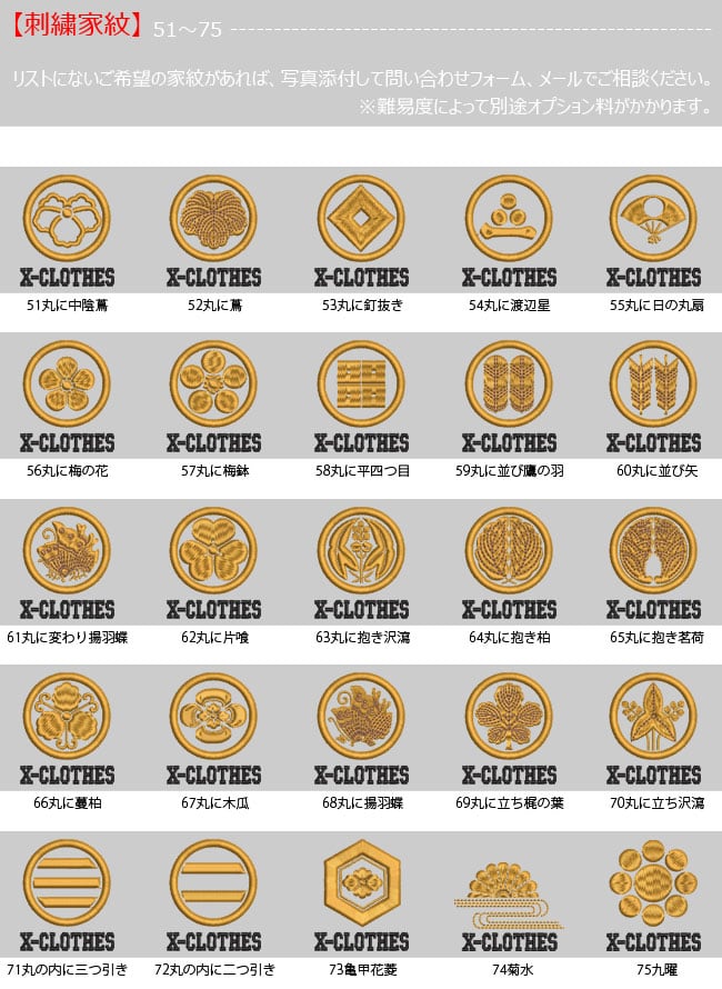 対応刺繍一覧:X-CLOTHES 伊達政宗 檜扇 違い矢 井桁 右重ね違い鷹の羽 下がり藤 花菱 割り菱 鬼蔦 亀甲に花菱 安藤藤 桔梗 橘 九つ星 九枚笹 九曜 隅立て四つ目 剣花菱 剣三つ柏 剣片喰 五瓜に唐花 庵木瓜 五三桐 五本骨扇 根笹 左三階松 笹竜胆 三つ引き 三つ星 三つ星に一の字 三つ柏 陰蔦 三つ鱗 三階菱 四つ目菱 四方剣花菱 四方木瓜 七つ星 十字 松皮菱 上の字 尻合わせ三つ蔦 右三つ巴 星梅鉢 中陰蔦 蔦 釘抜き 渡辺星 日の丸扇 梅の花 梅鉢 平四つ目 並び鷹の羽 5右二つ巴 並び矢 変わり揚羽蝶 片喰 抱き沢瀉 抱き柏 抱き茗荷 蔓柏 木瓜 揚羽蝶 立ち梶の葉 下がり藤 立ち沢瀉 亀甲花菱 菊水 九曜 隅切り角に木瓜 剣花菱 剣木瓜 源氏車 違い鷹の羽 五瓜に桔梗 五瓜に四つ目 唐花 五三桐 左 三つ割り菊 扇 藤巴 三階菱 違い丁子 七宝に花菱 上り藤 星梅鉢 折敷に三文字 鶴の丸 徳川葵 二引両 八つ矢車 八重桜 抱き茗荷 違い柏 うんこ コーヒー めでたい 花 菊の紋章 魚 犬 派 斎藤道三 坂本龍馬 自由飲酒 党 招き猫 上杉氏 陣旗 毘 龍 織田信長 真田幸村 西郷隆盛 石田三成 大谷吉継 鳥 徳川家康 猫派 不苦労 武田信玄 豊臣秀吉-五七桐 太閤桐 明智光秀 毛利家 丸に