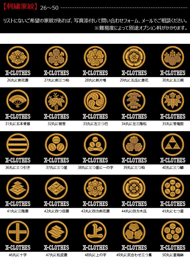対応刺繍一覧:X-CLOTHES 伊達政宗 檜扇 違い矢 井桁 右重ね違い鷹の羽 下がり藤 花菱 割り菱 鬼蔦 亀甲に花菱 安藤藤 桔梗 橘 九つ星 九枚笹 九曜 隅立て四つ目 剣花菱 剣三つ柏 剣片喰 五瓜に唐花 庵木瓜 五三桐 五本骨扇 根笹 左三階松 笹竜胆 三つ引き 三つ星 三つ星に一の字 三つ柏 陰蔦 三つ鱗 三階菱 四つ目菱 四方剣花菱 四方木瓜 七つ星 十字 松皮菱 上の字 尻合わせ三つ蔦 右三つ巴 星梅鉢 中陰蔦 蔦 釘抜き 渡辺星 日の丸扇 梅の花 梅鉢 平四つ目 並び鷹の羽 5右二つ巴 並び矢 変わり揚羽蝶 片喰 抱き沢瀉 抱き柏 抱き茗荷 蔓柏 木瓜 揚羽蝶 立ち梶の葉 下がり藤 立ち沢瀉 亀甲花菱 菊水 九曜 隅切り角に木瓜 剣花菱 剣木瓜 源氏車 違い鷹の羽 五瓜に桔梗 五瓜に四つ目 唐花 五三桐 左 三つ割り菊 扇 藤巴 三階菱 違い丁子 七宝に花菱 上り藤 星梅鉢 折敷に三文字 鶴の丸 徳川葵 二引両 八つ矢車 八重桜 抱き茗荷 違い柏 うんこ コーヒー めでたい 花 菊の紋章 魚 犬 派 斎藤道三 坂本龍馬 自由飲酒 党 招き猫 上杉氏 陣旗 毘 龍 織田信長 真田幸村 西郷隆盛 石田三成 大谷吉継 鳥 徳川家康 猫派 不苦労 武田信玄 豊臣秀吉-五七桐 太閤桐 明智光秀 毛利家 丸に