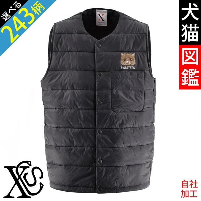リアル 犬 猫 ワンポイント 刺繍 オリジナル 中綿入り 薄い インナー ベスト ライト 後裾が長めのダックテール グッズ 柄 柴犬 チワワ シーズー シュナウザー パグ フレンチブルドッグ X-CLOTHES 猫図鑑 犬図鑑 ori-a-bst2-b10-s