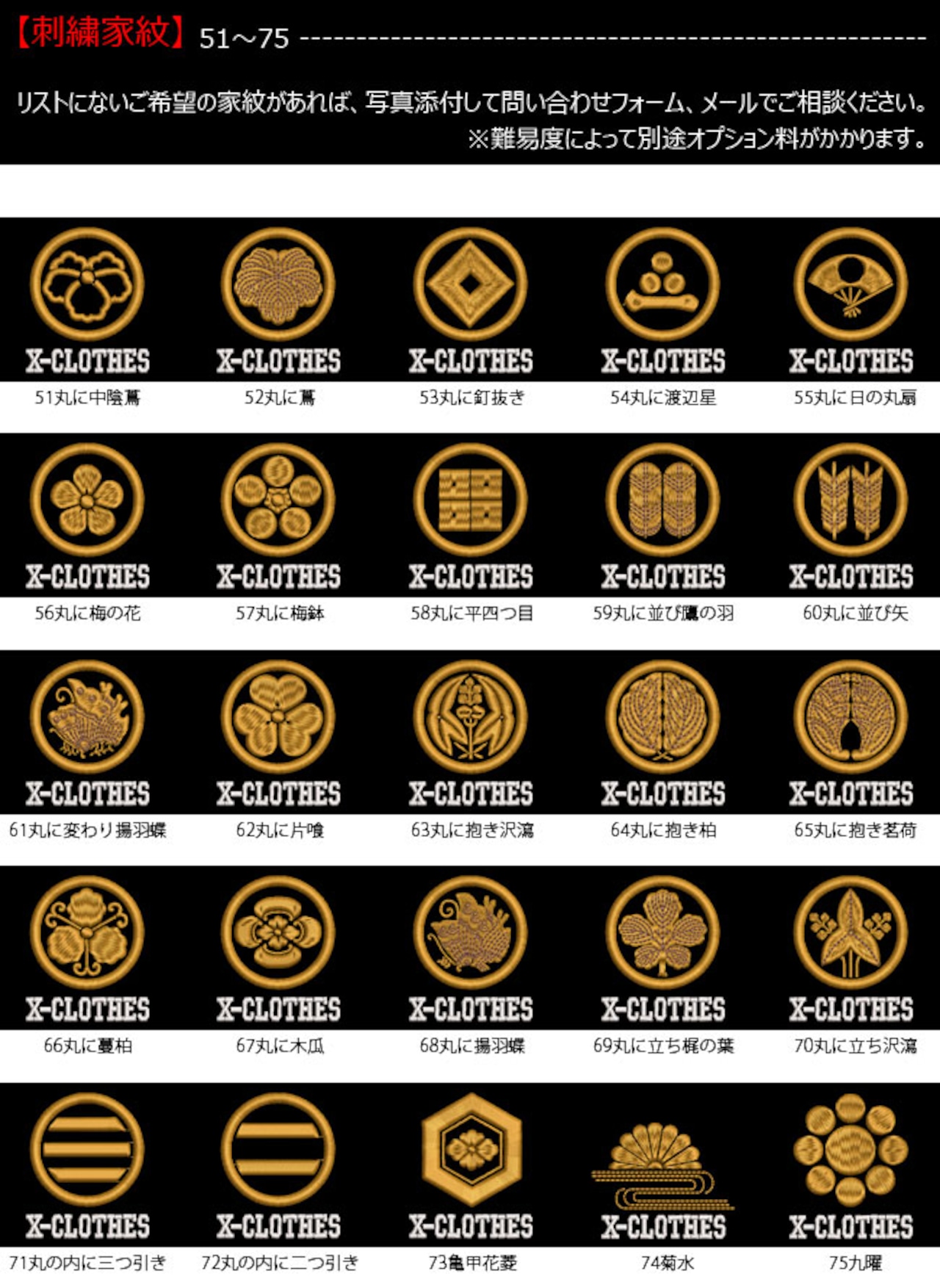 対応刺繍一覧:X-CLOTHES 伊達政宗3檜扇丸に違い矢丸に井桁丸に一つ引き丸に一の字丸に右重ね違い鷹の羽丸に下がり藤丸に花菱丸に割り菱丸に鬼蔦丸に亀甲に花菱安藤藤丸に桔梗丸に橘丸に九つ星丸に九枚笹丸に九曜丸に隅立て四つ目丸に剣花菱丸に剣三つ柏丸に剣片喰丸に五瓜に唐花庵木瓜丸に五三桐丸に五本骨扇丸に根笹丸に左三つ巴丸に左三階松丸に笹竜胆丸に三つ引き丸に三つ星丸に三つ星に一の字丸に三つ柏陰蔦丸に三つ鱗丸に三階菱丸に四つ目菱丸に四方剣花菱丸に四方木瓜丸に七つ星丸に十字丸に松皮菱丸に上の字丸に尻合わせ三つ蔦右三つ巴丸に星梅鉢丸に中陰蔦丸に蔦丸に釘抜き丸に渡辺星丸に日の丸扇丸に梅の花丸に梅鉢丸に平四つ目丸に並び鷹の羽5右二つ巴丸に並び矢丸に変わり揚羽蝶丸に片喰丸に抱き沢瀉丸に抱き柏丸に抱き茗荷丸に蔓柏丸に木瓜丸に揚羽蝶丸に立ち梶の葉下がり藤丸に立ち沢瀉丸の内に三つ引き丸の内に二つ引き亀甲花菱菊水九曜隅切り角に木瓜剣花菱剣木瓜源氏車丸に違い鷹の羽五瓜に桔梗五瓜に四つ目五瓜に唐花五三桐左三つ巴左二つ巴三つ割り菊三つ扇三つ藤巴三階菱丸に違い丁子七宝に花菱上り藤星梅鉢折敷に三文字鶴の丸徳川葵二引両八つ矢車八重桜抱き茗荷丸に違い柏うんこ3コーヒー2コーヒー3めでたい2花派2菊の紋章魚派2犬派2斎藤道三2坂本龍馬2自由飲酒2自由飲酒3招き猫2上杉謙信3上杉氏陣旗-毘上杉氏陣旗-龍織田信長3真田幸村3西郷隆盛2石田三成2大谷吉継2鳥派2徳川家康2猫派2不苦労2不苦労3武田信玄2豊臣秀吉-五七桐豊臣秀吉-太閤桐明智光秀2毛利家2党新選組