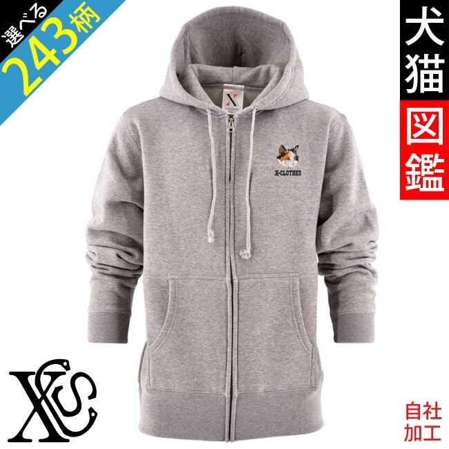 リアル 犬 猫 裏起毛 パーカー 刺繍 プレゼント 長袖 フルジップ メンズ オリジナル 無地 ワンポイント ロゴ おしゃれ フード付き スウェット トレーナー 灰 父の日 トップス グッズ 柄 柴犬 チワワ シーズー シュナウザー パグ X-CLOTHES 猫図鑑 犬図鑑 ori-am-pzn3-g10-s