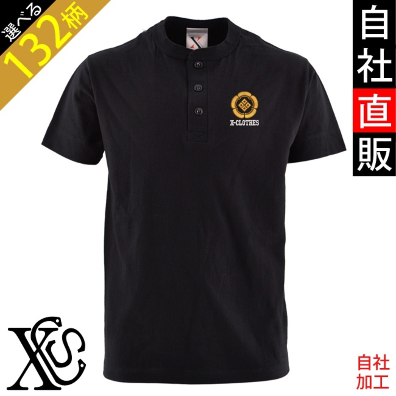 ワンポイント 刺繍 家紋 オリジナル 5.6オンス ヘンリーネック Tシャツ メンズ 半袖 カットソー ブラック ホワイト 黒 白 柄 ロゴ ギフト プレゼント 誕生日 父の日 母の日 グッズ 丸に 五瓜 桔梗 巴 藤 羽 菱 唐花 木瓜 蔦 桐 ori-am-tst5-b07-s | 刺繍の森X-CLOTHES【公式通販サイト】