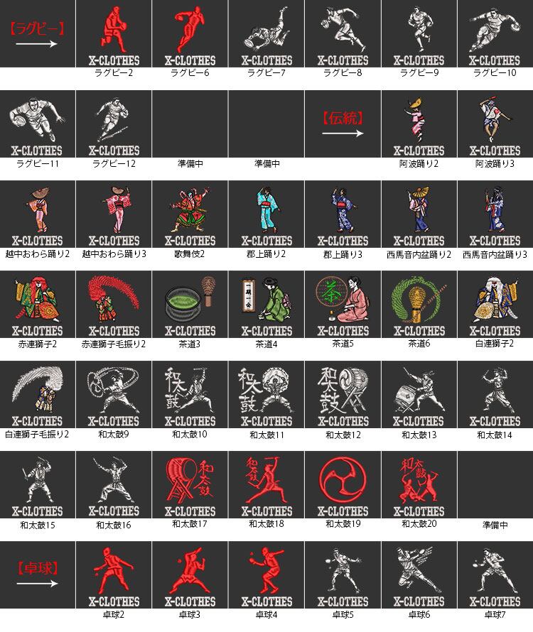X-CLOTHES 競技音楽一覧:けん玉 アメフト キックボクシング ギター ゴルフ サッカー サックス サーフィン スキー スケートボード スノーボード ダンス ダーツ チューバ テニス トロンボーン ドッチボール ハンドボール バイオリン バスケ バドミントン バレエ バレーボール ピアノ フィギュアスケート フラガール ベース ボクシング ボーリング マラソン ムエタイ ヨガ ラグビー ラケット 体操 剣道 卓球 和太鼓 囲碁 大相撲 居合 弓道 柔道 歌舞伎 水泳 水球 白連獅子 白連獅子毛振り 空手 競艇 競輪 競馬 茶道 西馬音内盆踊り 赤連獅子 赤連獅子毛振り 越中おわら踊り 郡上踊り 野球 釣り 阿波踊り 陸上 陸上走り 音符 麻雀-発 1 2 3 4 5 6 7 8 9 0