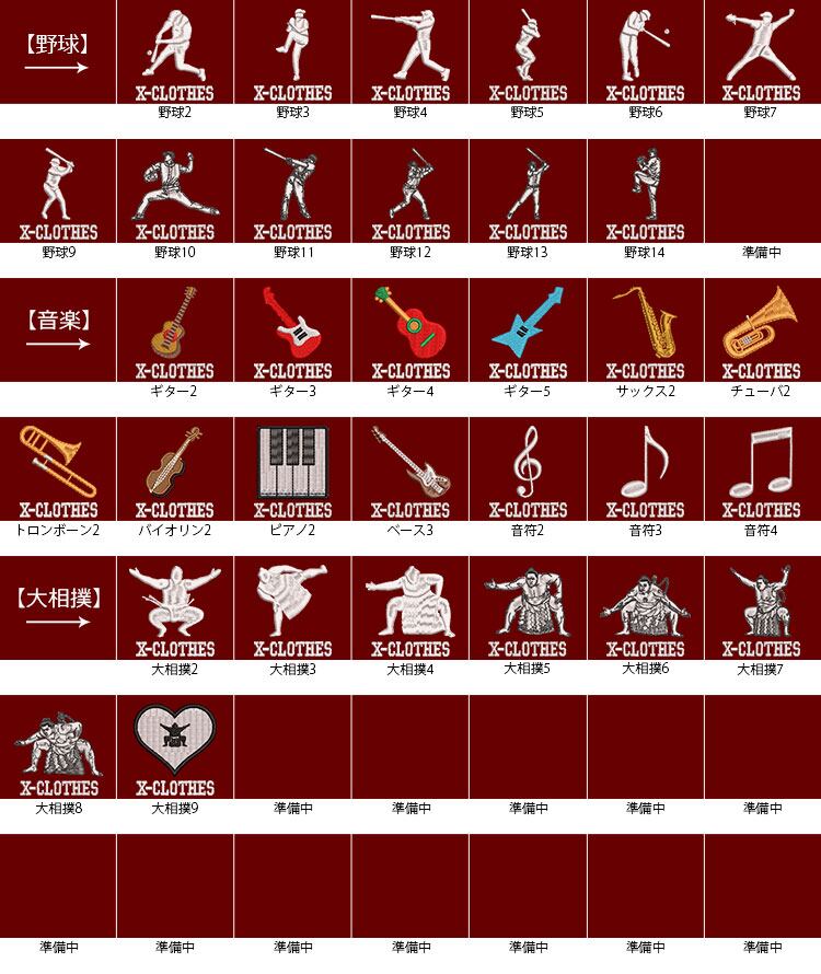 X-CLOTHES 競技音楽一覧:けん玉 アメフト キックボクシング ギター ゴルフ サッカー サックス サーフィン スキー スケートボード スノーボード ダンス ダーツ チューバ テニス トロンボーン ドッチボール ハンドボール バイオリン バスケ バドミントン バレエ バレーボール ピアノ フィギュアスケート フラガール ベース ボクシング ボーリング マラソン ムエタイ ヨガ ラグビー ラケット 体操 剣道 卓球 和太鼓 囲碁 大相撲 居合 弓道 柔道 歌舞伎 水泳 水球 白連獅子 白連獅子毛振り 空手 競艇 競輪 競馬 茶道 西馬音内盆踊り 赤連獅子 赤連獅子毛振り 越中おわら踊り 郡上踊り 野球 釣り 阿波踊り 陸上 陸上走り 音符 麻雀-発 1 2 3 4 5 6 7 8 9 0