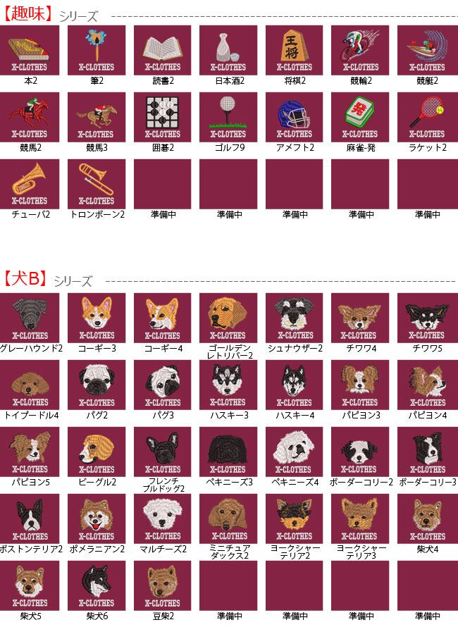 対応刺繍一覧:X-CLOTHES 1234567890兜直江兼続ローマ兜伊達政宗源義経上杉謙信織田信長真田幸村関羽金魚エンゼルフィッシュカジキカニ柴犬ゴードンセッターサモエドダックスフントトイプードルドーベルマンハスキーバセットパピヨンペキニーズロットワイラー柴犬狆チワワキャバリアグレートデーンコーギーシーズー秋田犬ダルメシアントイテリアスパニエルラッセルテリアシェパードパグハスキービーグルフレンチブルドッグボーダーコリーボストンテリアポメラニアンマルチーズミニチュアダックスヨークシャーテリア豆柴グレーハウンドゴールデンレトリバーシュナウザー蝶カタツムリ蚊昆虫麻雀-発ゴルフチューバトロンボーン囲碁競艇競馬競輪将棋読書日本酒筆本アメフトラケット葉っぱカーネーション薔薇サボテンハイビスカス苗木椿おにぎりオムレツキュウリサーモントウモロコシトマトパイナップルビールブロッコリーもつ鍋ラーメンラディッシュ寿司玉子いくらエビマグロ焼き鳥焼肉桃目玉焼き餃子バナナ赤カブ鳳凰インコカワセミコザクラインコセキセイインコツバメフクロウペンギン鷹ボタンインコマメルリハマメルリハ桜文鳥鷹白文鳥文鳥オカメインココザクラインコシルバー文鳥セキセイインコセキセイインコハシビロコウアライグマカメレオンカンガルーカンガルーコアラコアラコアラコアラボスゴリラディプロドクスティラノサウルスネズミネズミハムスターパンダパンダパンダユニコンリケラトプス牛虎子豚北極キツネ北極クマミドリガメ狼ライオンネザーランドドワーフパンダフェネックギツネフェレットフェレットホーランドロップモモンガレッサーパンダ龍アルパカカピバラカワウソシマリスチンチラ猫エキゾチックアメリカンショートヘアシャムスコティッシュフォールドロシアンブルー黒猫白猫馬唇うんこハート傷昇龍−日本地図心臓だるま天狗