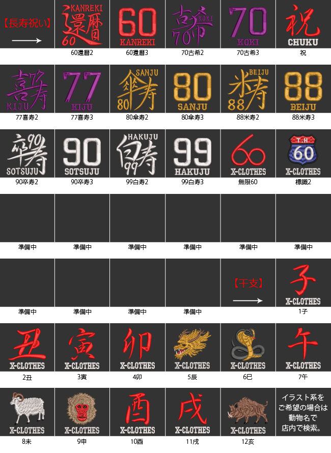 対応刺繍一覧:X-CLOTHES アイナメ アオリイカ アカハタ アカメバル イトウ オジサン オニカサゴ カワハギ カンパチ キジハタ シロギス キンメダイ クエ クロダイ サケ シーバス シマアジ カメ セマルハコガメ トラフグ ナマズ ニジマス ハリセンボン ヒラマサ ヒラメ ブラックバス ブリ マアジ マゴチ 跳ねる ハート魚 日の丸魚 鯛 バラパグ ボーダーコリー 柴犬 怒る ミニチュア ピンシャー ラブラドール レトリバー スロット ダーツ チューリップ ばれたか プロビデンスの目 ベース 旭日旗 競馬 隈取 蛇ウロボロス 水球 バイク キャベツ クロワッサン たまねぎ ニンニク ネギ ピーマン メロンパン 国産米 ウサギ かかってこい シーサー ハリネズミ 祈りナマケモノ マーモット 恐竜化石 見ざる 言わざる 聞かざる 子豚 狼 蜈蚣 印鑑 シャー ロシアンブルー ハチワレ 黒猫 白猫 ホシガラス 鴨 雷鳥 還暦 古希 喜寿 傘寿 米寿 卒寿 白寿 無限 標識 【A】さくら アインシュタイン サンタクロース セクシーガール チェゲバラ ひょっとこ 鬼丸 宮本武蔵 恵比寿天 佐々木小次郎 坂本龍馬 死神 小面 織田信長 青鬼 赤鬼 大黒天 徳川家康 能面翁 般若 美人 豊臣秀吉 干支 1 2 3 4 5 6 7 8 9 0