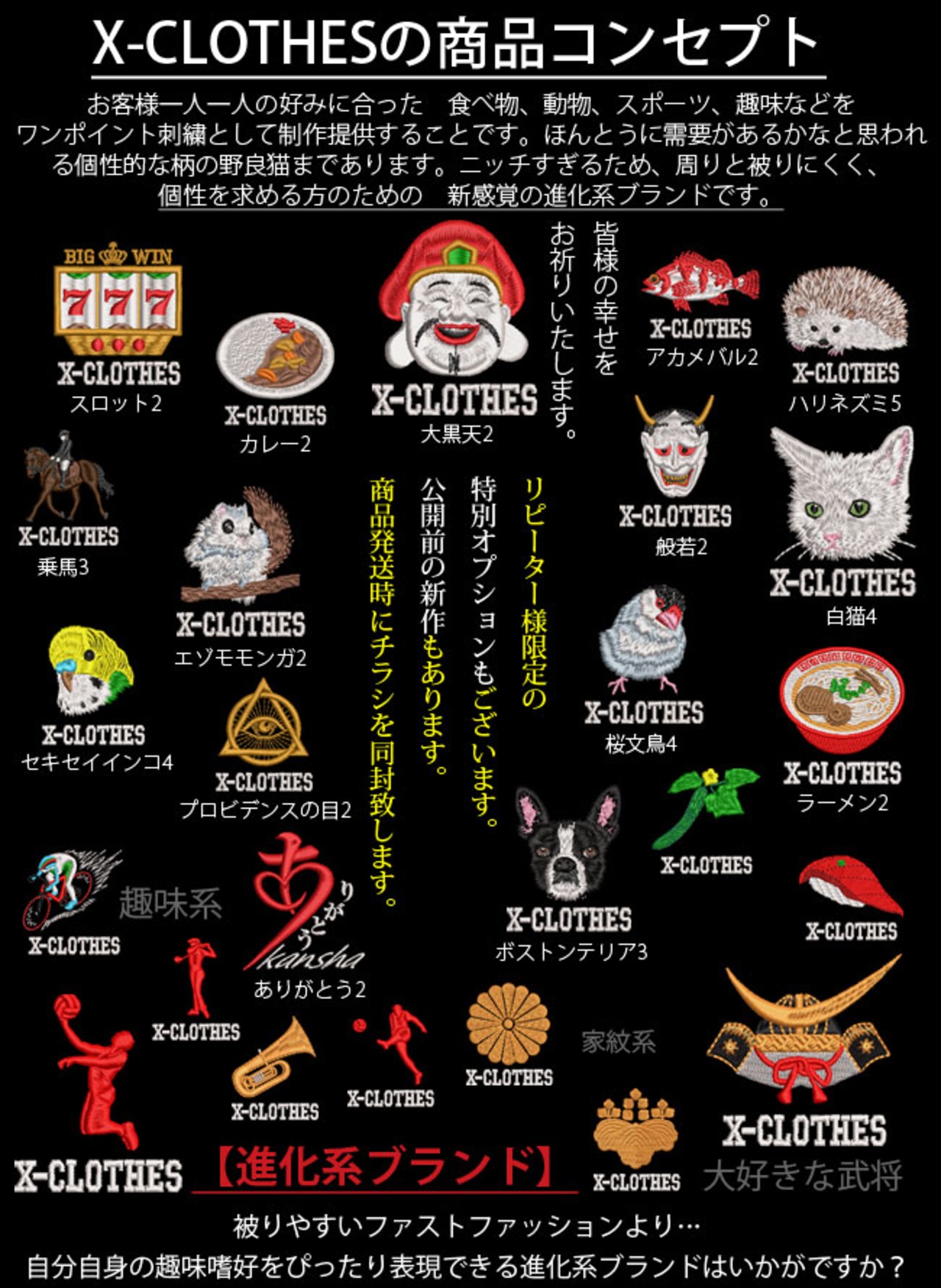 対応刺繍一覧:X-CLOTHES 刺繍の森X-CLOTHES1234567890シマエナガハートひび割れ2ハート割れ2ハート善悪2ハート善悪蛇2ハート不完全2ハート不完全3星5ハシビロコウ4ハシビロコウ5ハシビロコウ6ハシビロコウ7パンダ赤ちゃん2パンダひよこ3ひよこ4雛鴨2雄鶏2ネオンテトラ2アロワナ過背金龍2アロワナ紅龍2アロワナ紅龍3アロワナ青龍2イカ2うなぎ2うなぎ3うなぎ4クラゲ2タコ3ジャイアントベタ2ジャイアントベタ3ジャイアントベタ4ジャイアントベタ5ザリガニ2コーギー5コーギー6ペキニーズ5ペキニーズ6ペキニーズ7ラブラドゥードル2柴犬10柴犬11柴犬9猫へそ天2猫へそ天3飛び猫2飛び猫3飛び猫4弓道3三日月2照準2乗馬キビタキ2キビタキ3ジョウビタキ3ジョウビタキ4ジョウビタキ5ジョウビタキ6ジョウビタキ7ヤマガラ2ヤマガラ3ルリビタキカンガルー親子2ペガサス馬2牛6牛7牛8牛9馬シマリス4チンパンジー2ハリネズミ5河童3虎毛秋田犬2マンチカン3マンチカン4チーター2ライオン9月に狼2虎11虎12虎13鷲2鷲3フクロウ8フクロウ9フクロウ10フクロウ11フクロウ12鷹8鷹9鷹10鷹11鷹12鳥野鳥 ステーキ ズワイガニ ナポリタン ハンバーグ 小籠包 生姜焼き 豚骨ラーメン ウーパールーパー カバ サイ マーモット ムース リス 烏骨鶏 鹿 サックス 零戦52型 けん玉 ピアノ