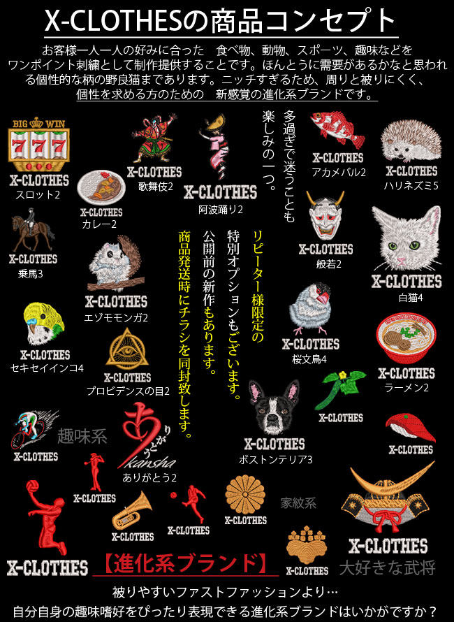 対応刺繍一覧:X-CLOTHES 刺繍の森X-CLOTHESおもしろ文字四文字熟語X-CLOTHESM総理アホイケ麺うどんうんこオタクげん気だんなパンだひじきもやしやる気よめらーめんリア充愛妻家悪人飲酒党王子俺天才可愛家族花粉症寒来感謝甘党還暦鬼だ鬼嫁義理苦天空心兄だ激やせ限界故障中好き幸せ腰痛根性最強最高妻雑菌雑草死んだ脂肪侍痔女痔男自由失敗失恋酒ひと修業中傷少食笑顔色毛信用零真心神だ2神だ3辛党草食足長大福断煙断酒池麺中毒釣人定痔天才天然怒り特攻毒舌豚感豚豚豚欲鈍感軟骨肉食忍忍者燃料酒馬鹿薄毛爆釣り反抗期美人姫不健康夫夫婦負けん気福福岡変体萌え褒のび褒めて本気凡人満涙夢なし夢職夢無無骨無職無敵無理無力妄想族妄想中勇者涙美豚冷和零和霊和恋釣り老春綺麗餃子卒団記念品部活卒業滅鬼疲れの刃 あらまニャン お疲れパン カタツムリ カンフーニャン カンフーニャン デブワン なになにワン ハエ びっくりニャン レッサーパンダ 雨カエル 何してるニャン 何見てるワン 画家ナマケモノ 嬉しいワン 機嫌悪ワン 見つめる猫 見るなワン 幸うんだワン 考カエル 真犯人ワン 怒るニャン 動けないニャン 不機嫌ニャン 食べ物 カレー たんぽぽ トビウオ とんかつ 海老 茶道 唐揚げ 辛神 徳川家康 忍者 風神 雷神 柴犬 猫 ペキニーズ夏用