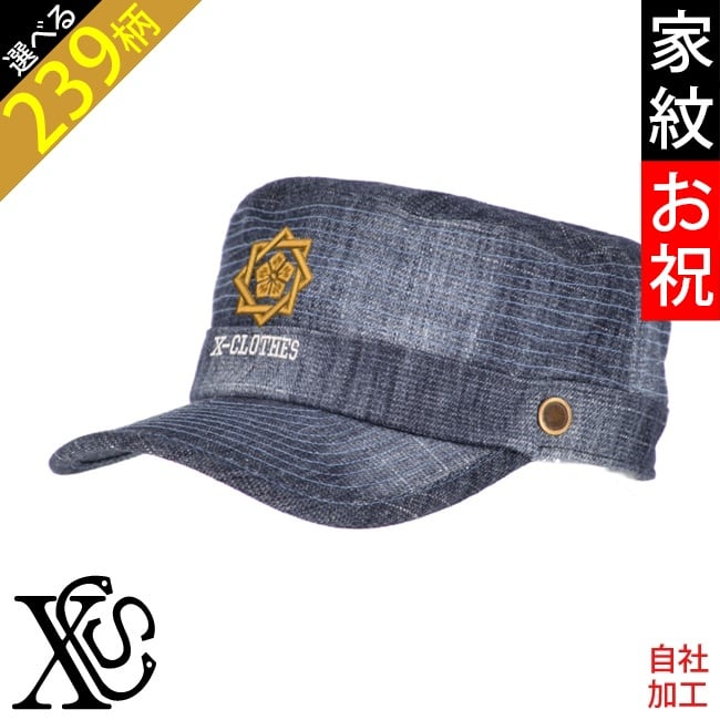 家紋お祝 還暦 ワンポイント 刺繍 オリジナル デニムステッチ ワークキャップ メンズ レディース 帽子 自社ブランド ロゴ グッズ 柄 誕生日 プレゼント 丸に 五瓜 桔梗 巴 藤 羽 菱 唐花 木瓜 蔦 桐 ori-a-cap36-b07-s