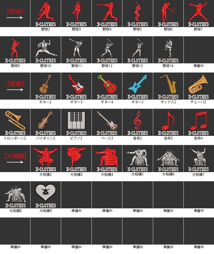 X-CLOTHES 競技音楽一覧:けん玉 アメフト キックボクシング ギター ゴルフ サッカー サックス サーフィン スキー スケートボード スノーボード ダンス ダーツ チューバ テニス トロンボーン ドッチボール ハンドボール バイオリン バスケ バドミントン バレエ バレーボール ピアノ フィギュアスケート フラガール ベース ボクシング ボーリング マラソン ムエタイ ヨガ ラグビー ラケット 体操 剣道 卓球 和太鼓 囲碁 大相撲 居合 弓道 柔道 歌舞伎 水泳 水球 白連獅子 白連獅子毛振り 空手 競艇 競輪 競馬 茶道 西馬音内盆踊り 赤連獅子 赤連獅子毛振り 越中おわら踊り 郡上踊り 野球 釣り 阿波踊り 陸上 陸上走り 音符 麻雀-発 1 2 3 4 5 6 7 8 9 0