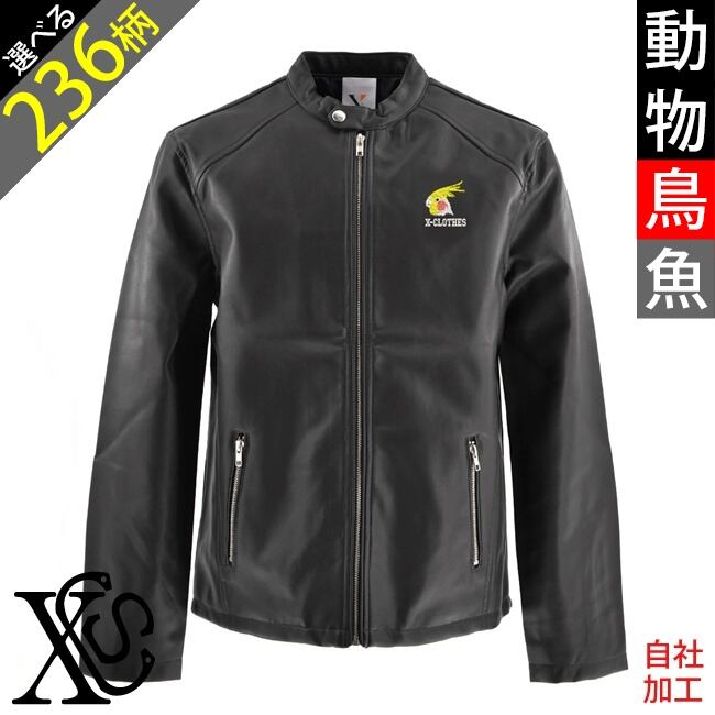 動物鳥魚 刺繍 オリジナル ワンポイント ライダース ジャケット メンズ フェイクレザー 合皮 ブルゾン 自社ブランド ロゴ グッズ 柄 おしゃれ プレゼント 馬 鳥 インコ 文鳥 パンダ 魚 動物 ori-am-jkt9-b06-s