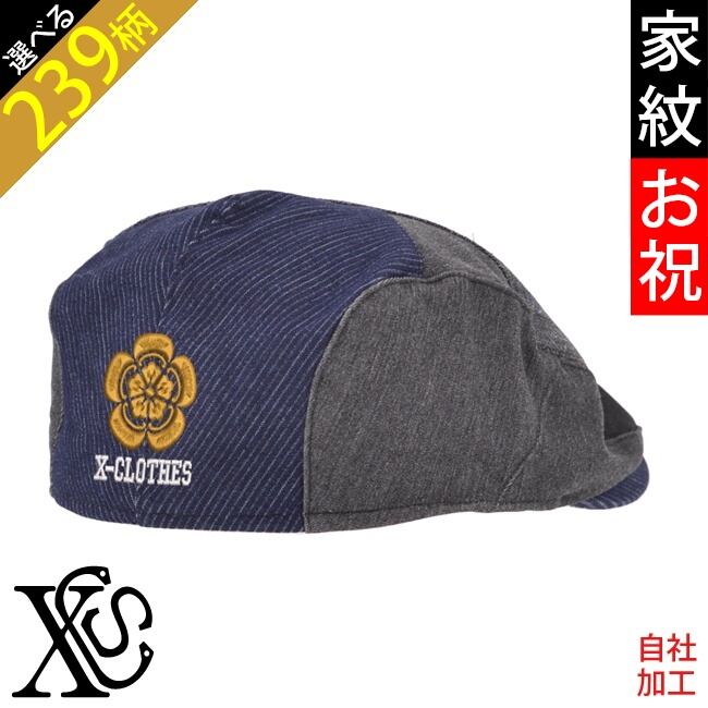 家紋お祝 還暦 ワンポイント 刺繍 帽子 デニム スラッシュ 切替 ハンチング メンズ ベレー帽 レディース 雑貨 グッズ 自社ブランド 柄 丸に 五瓜 桔梗 巴 藤 羽 菱 唐花 木瓜 蔦 桐 クリスマス ori-a-cap62-b07-s