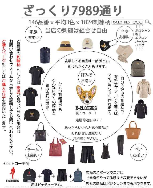 対応刺繍一覧:X-CLOTHES 兜 直江兼続 ローマ 伊達政宗 源義経 上杉謙信 織田信長 真田幸村 関羽 金魚 カニ 柴犬 ゴードンセッター サモエド ダックスフント トイプードル ドーベルマン ハスキー バセット パピヨン ペキニーズ ロットワイラー 柴犬 狆 チワワ キャバリア グレートデーン コーギー シーズー 秋田犬 ダルメシアン トイテリア スパニエル ラッセルテリア シェパード パグ ハスキー ビーグル フレンチブルドッグ ボーダーコリー ボストンテリア ポメラニアン マルチーズ ミニチュアダックス ヨークシャーテリア 豆柴 グレーハウンド ゴールデンレトリバー シュナウザー チューバ トロンボーン 囲碁 競艇 競馬 競輪 将棋 日本酒 アメフト テニス カーネーション おにぎり オムレツ キュウリ トマト ビール ブロッコリー もつ鍋 ラーメン 寿司 焼き鳥 焼肉 桃 目玉焼き 餃子 鳳凰 インコ カワセミ コザクラ セキセイ フクロウ ペンギン 鷹 ボタン マメルリハ 桜 文鳥 オカメ コザクラ シルバー ハシビロコウ カンガルー コアラ ボスゴリラ 恐竜 ハムスター パンダ ユニコン 牛 虎 子豚 カメ 狼 ライオン うさぎ モモンガ レッサー 龍 アルパカ カワウソ チンチラ 猫 黒 白 馬